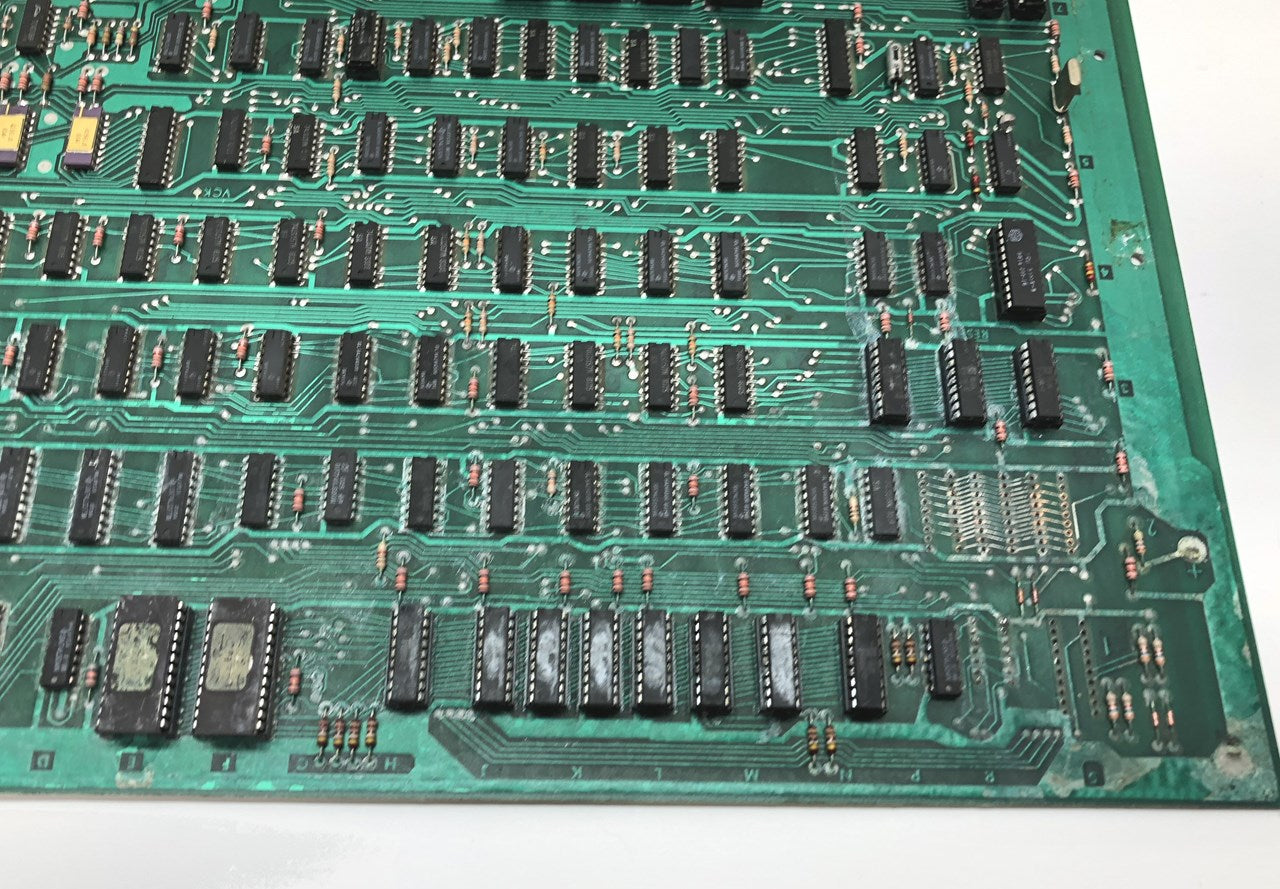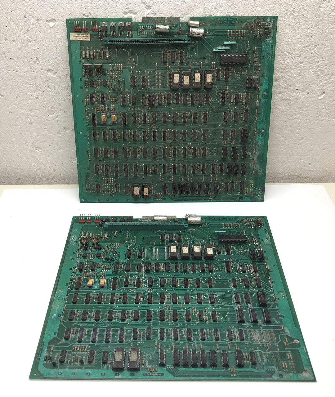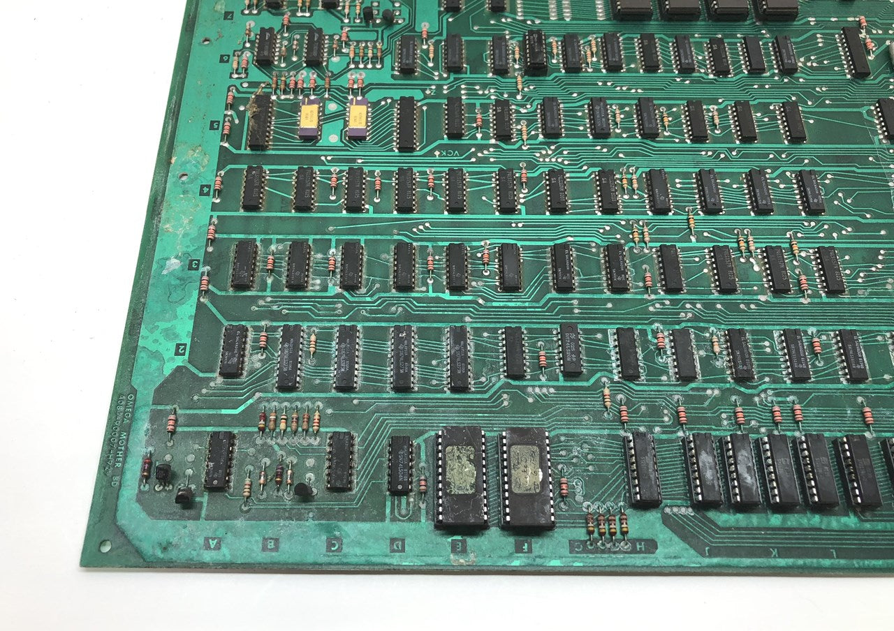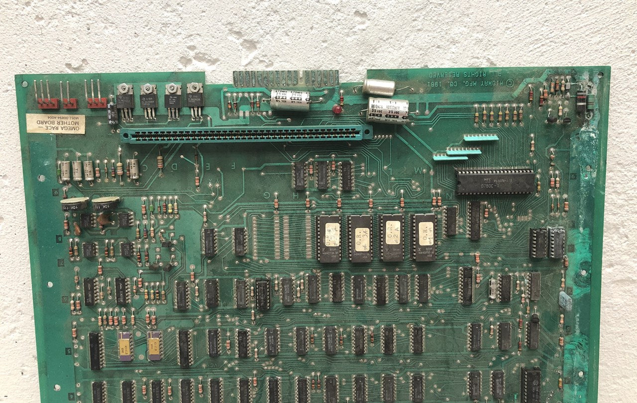 Pair of original Midway Omega Race arcade game mother board circuit boards that have some noticeable corrosion. Consider at least one of these parts boards, the other one might be brought back with quite a bit of work. What you see is what you get, the one does look complete, the other is missing some ICs. Both have their AD561 DACs installed that look to be in pretty good condition.