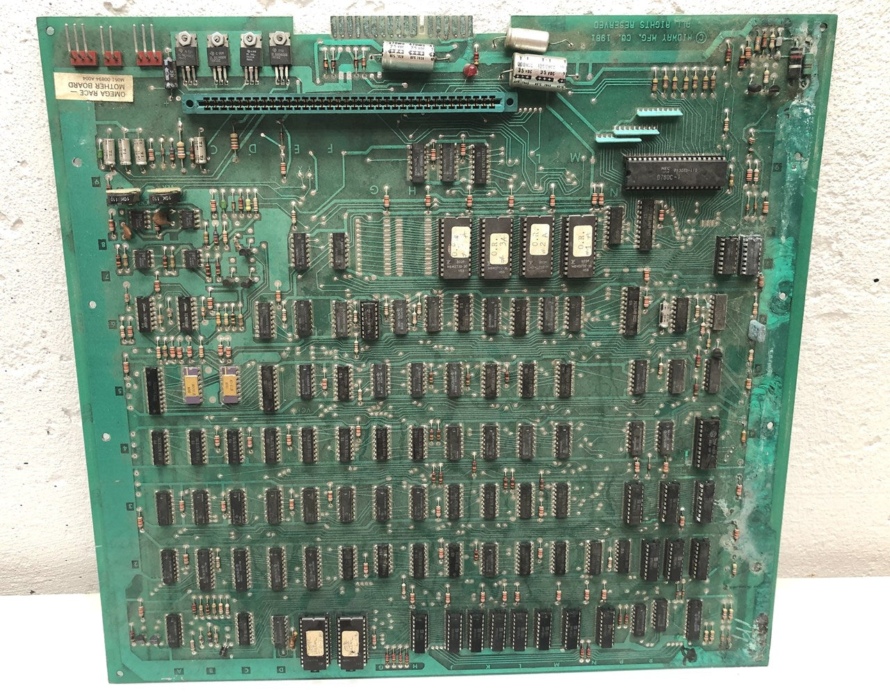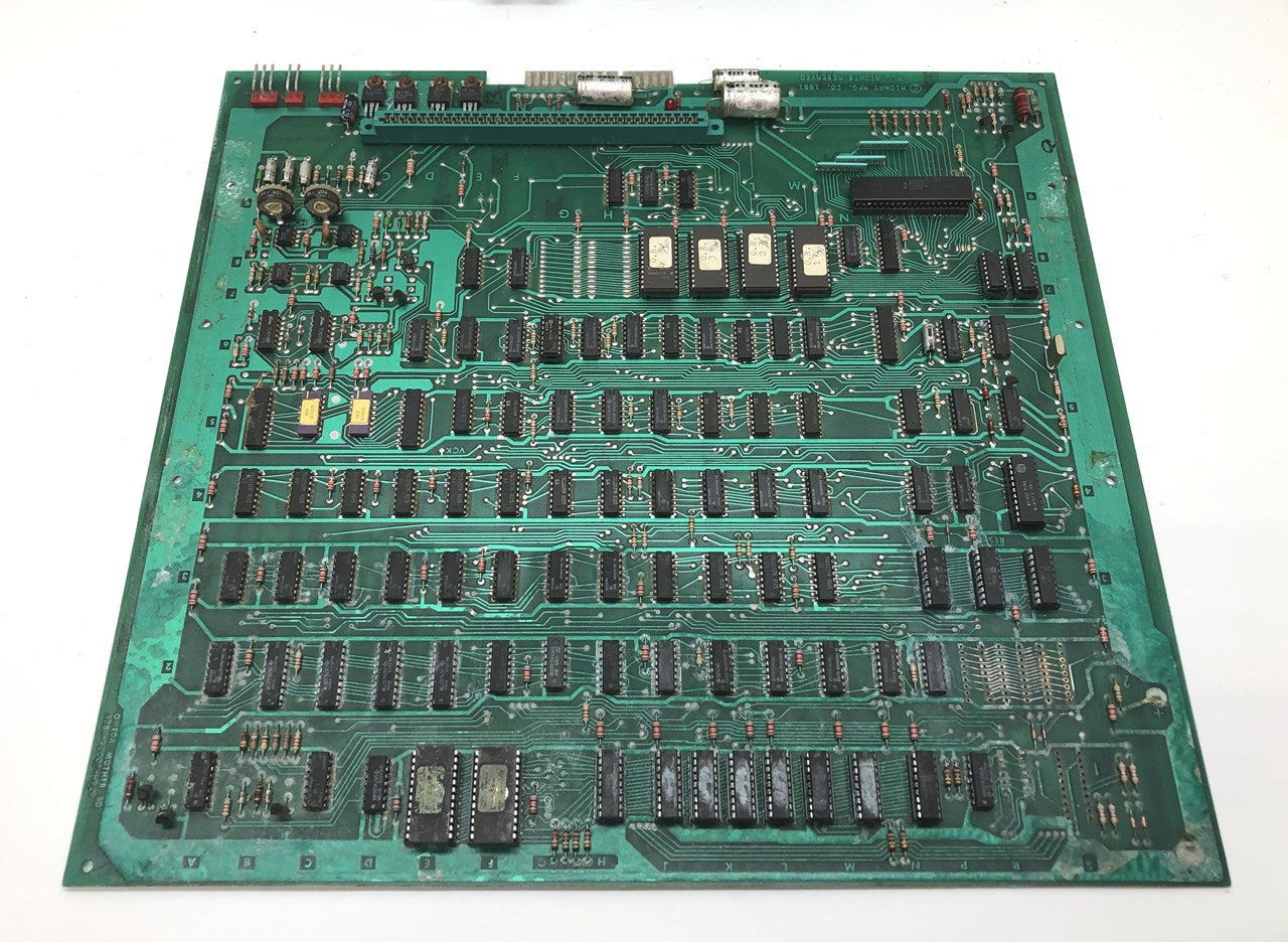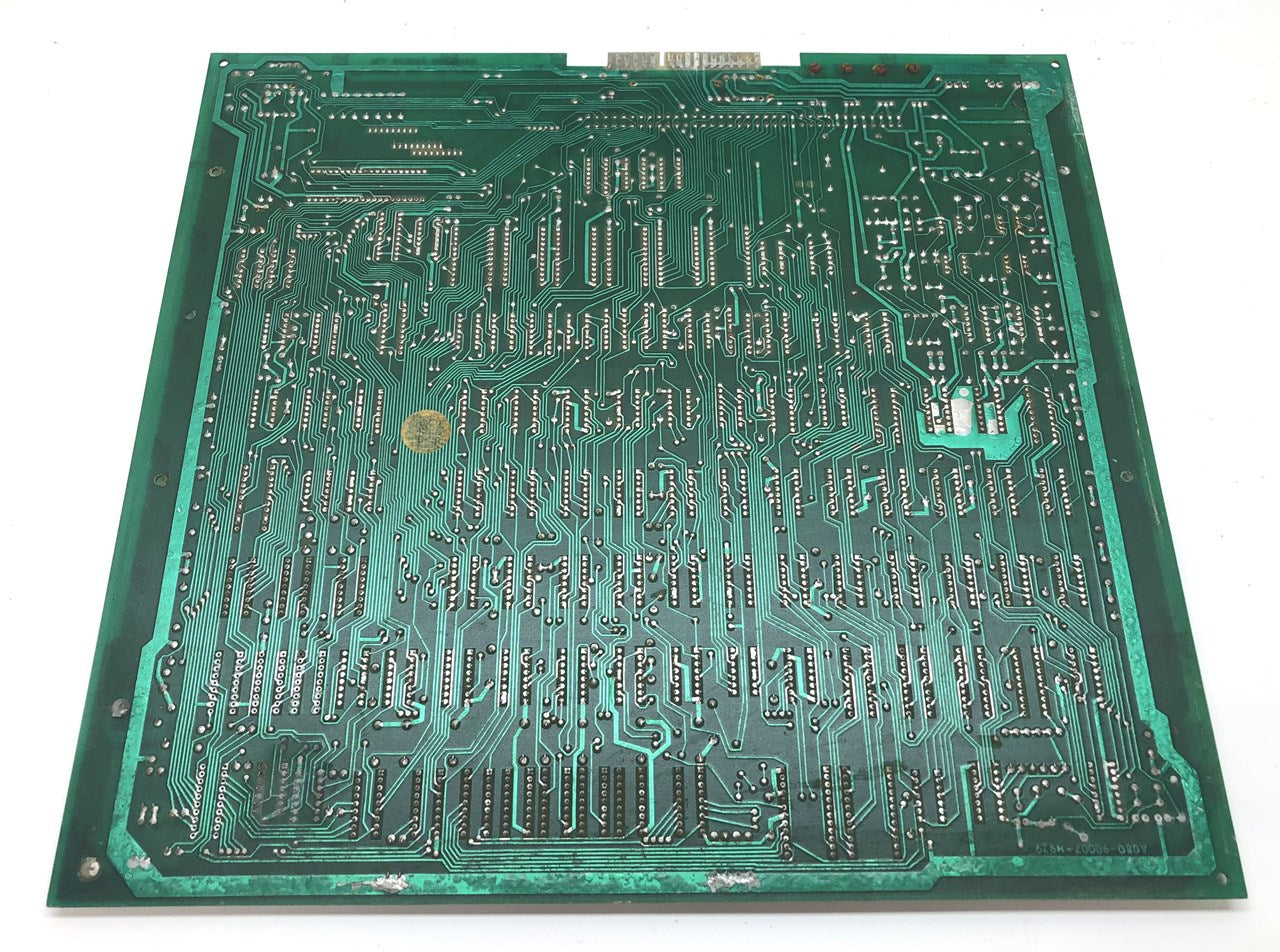 Pair of original Midway Omega Race arcade game mother board circuit boards that have some noticeable corrosion. Consider at least one of these parts boards, the other one might be brought back with quite a bit of work. What you see is what you get, the one does look complete, the other is missing some ICs. Both have their AD561 DACs installed that look to be in pretty good condition.