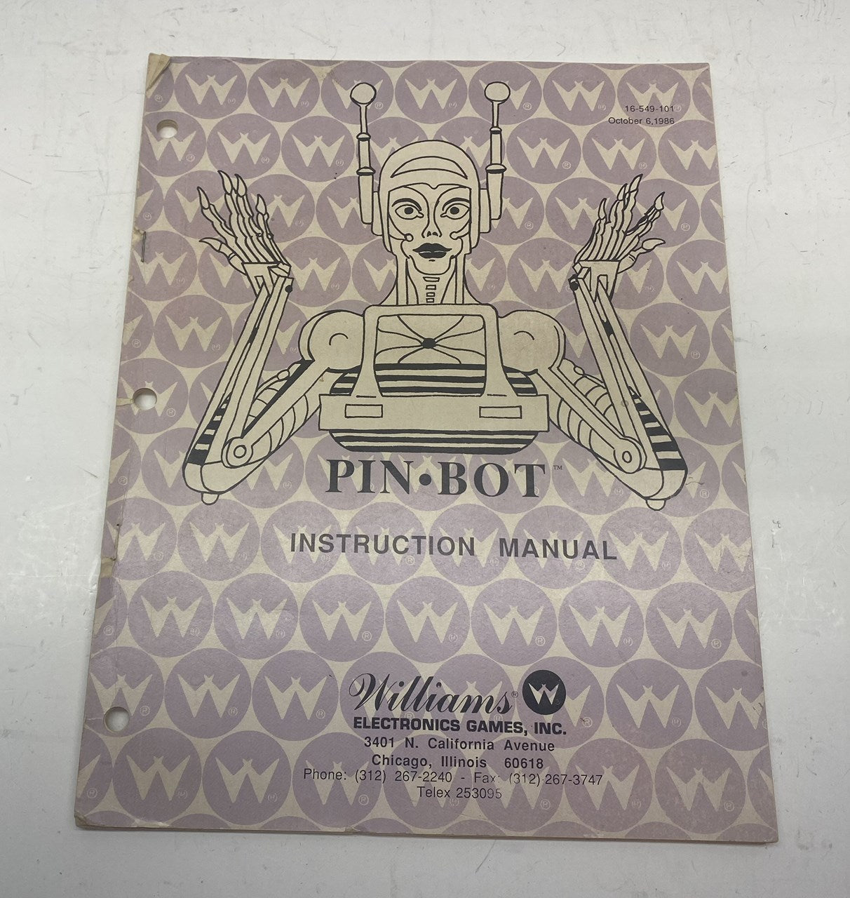 Original Williams Pin-Bot pinball machine Instruction Manual. Includes operations and adjustments info, testing and problem diagnosis, parts information and wiring diagrams. Manual is missing its back cover, otherwise in good condition.