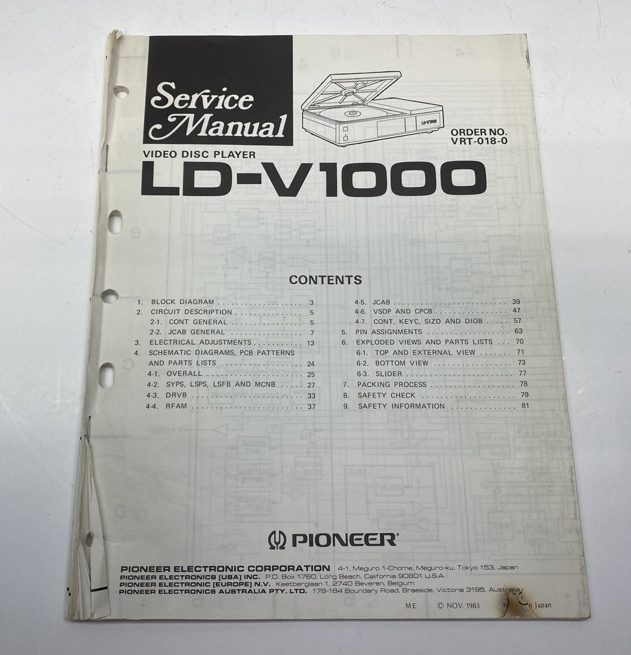 Original Pioneer LD-V1000 Laser Video Disc Player Service Manual. Includes operating info and schematics, as well as other information.