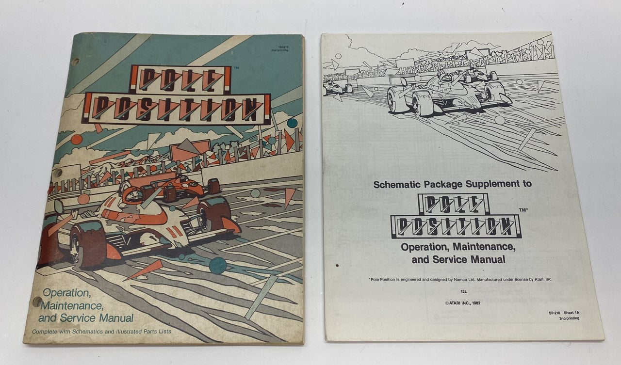 Complete Atari Pole Position manual in used condition with some cover wear. Manual covers operating procedures, game maintenance and has an illustrated parts list. Also included is the Supplemental Schematic Package, which includes complete game schematics.