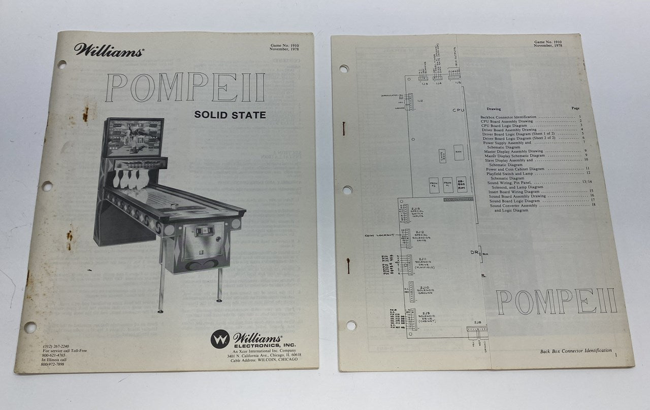 Original Williams Pompeii Solid State shuffle bowler machine game manual and schematic package in used condition.