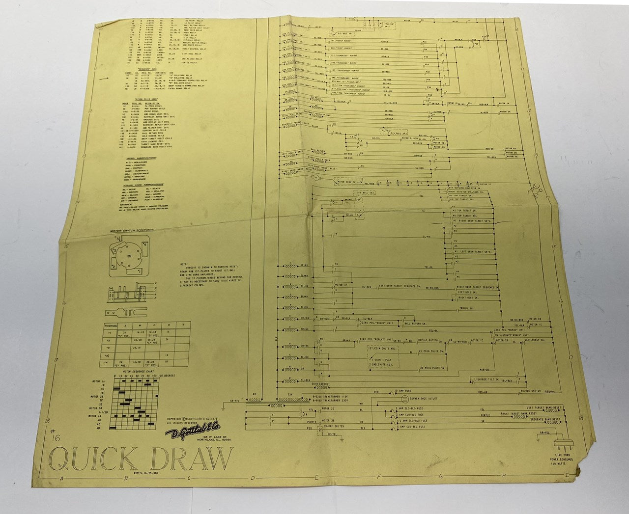 Original Gottlieb Quick Draw pinball machine schematic/wiring diagram from 1975.