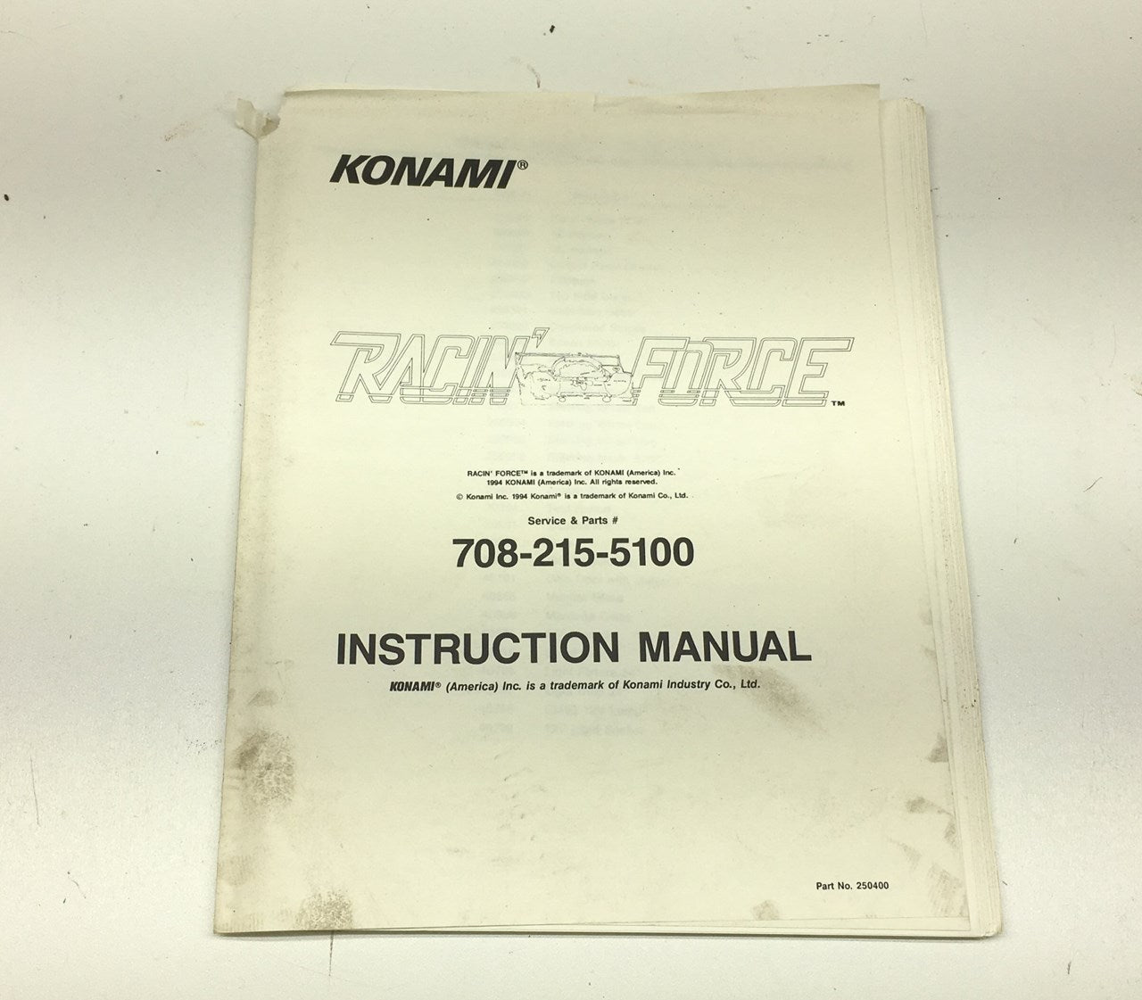 Original Konami Racin' Force arcade game instruction manual in used condition. Includes game operation information, dipswitch settings, and schematics.