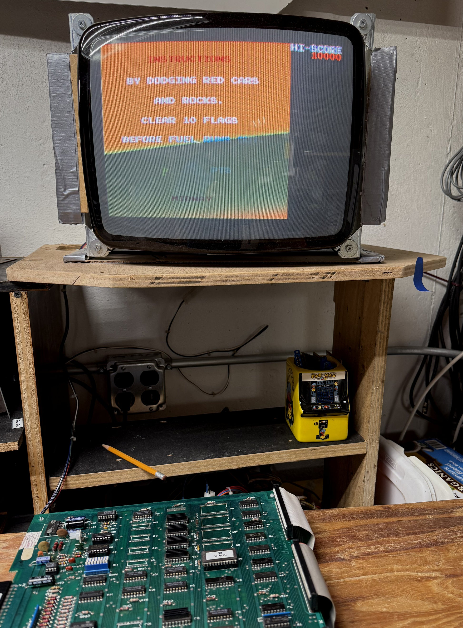 Tested and working Midway Rally-X arcade game circuit board from 1981. Board uses a horizontal monitor and a unique pinout.