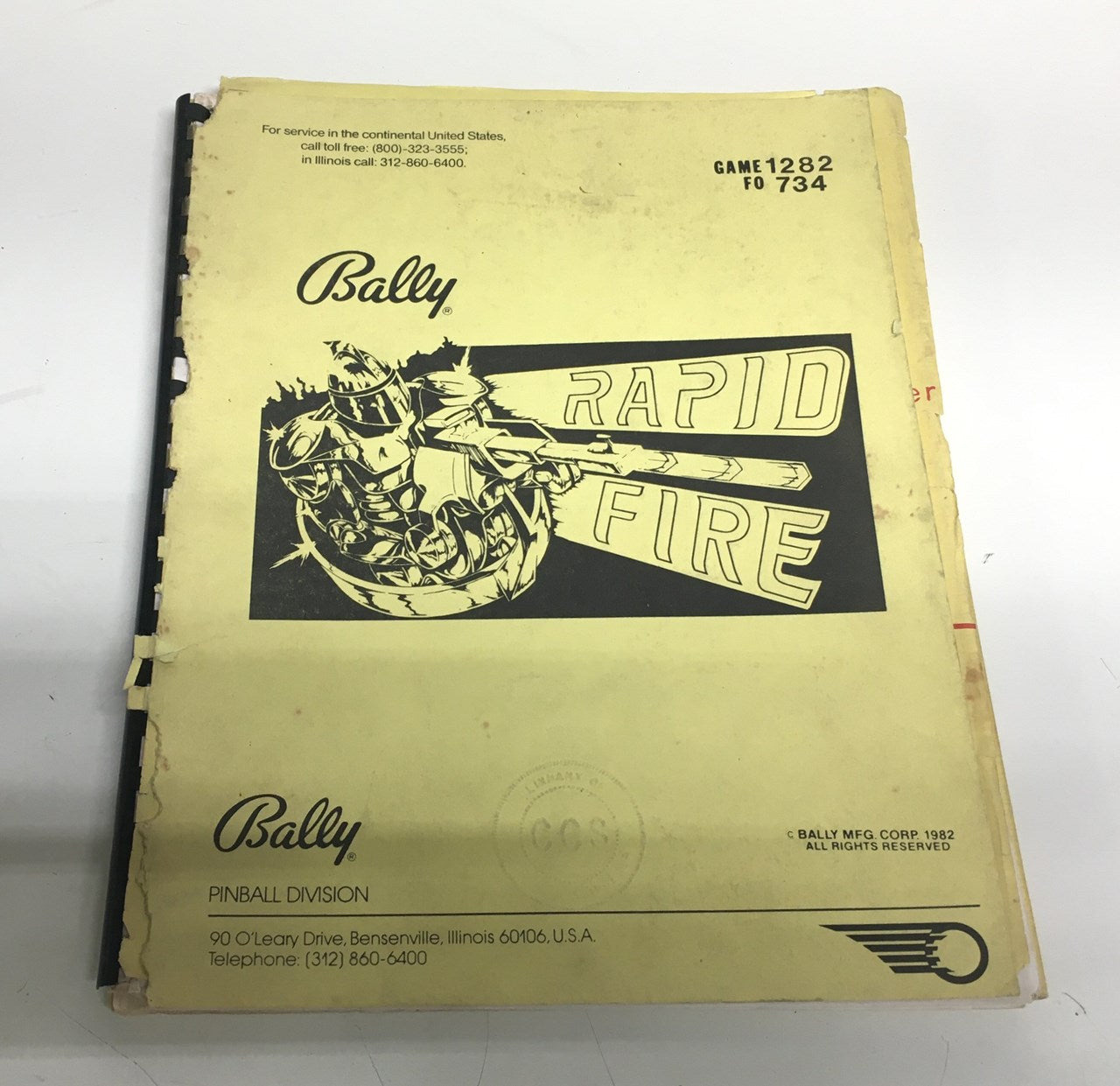 Original Bally Rapid Fire pinball machine manual from 1982. Includes operations and adjustments info, testing and problem diagnosis, parts information and wiring diagrams. Manual has some typical wear from use over the years.