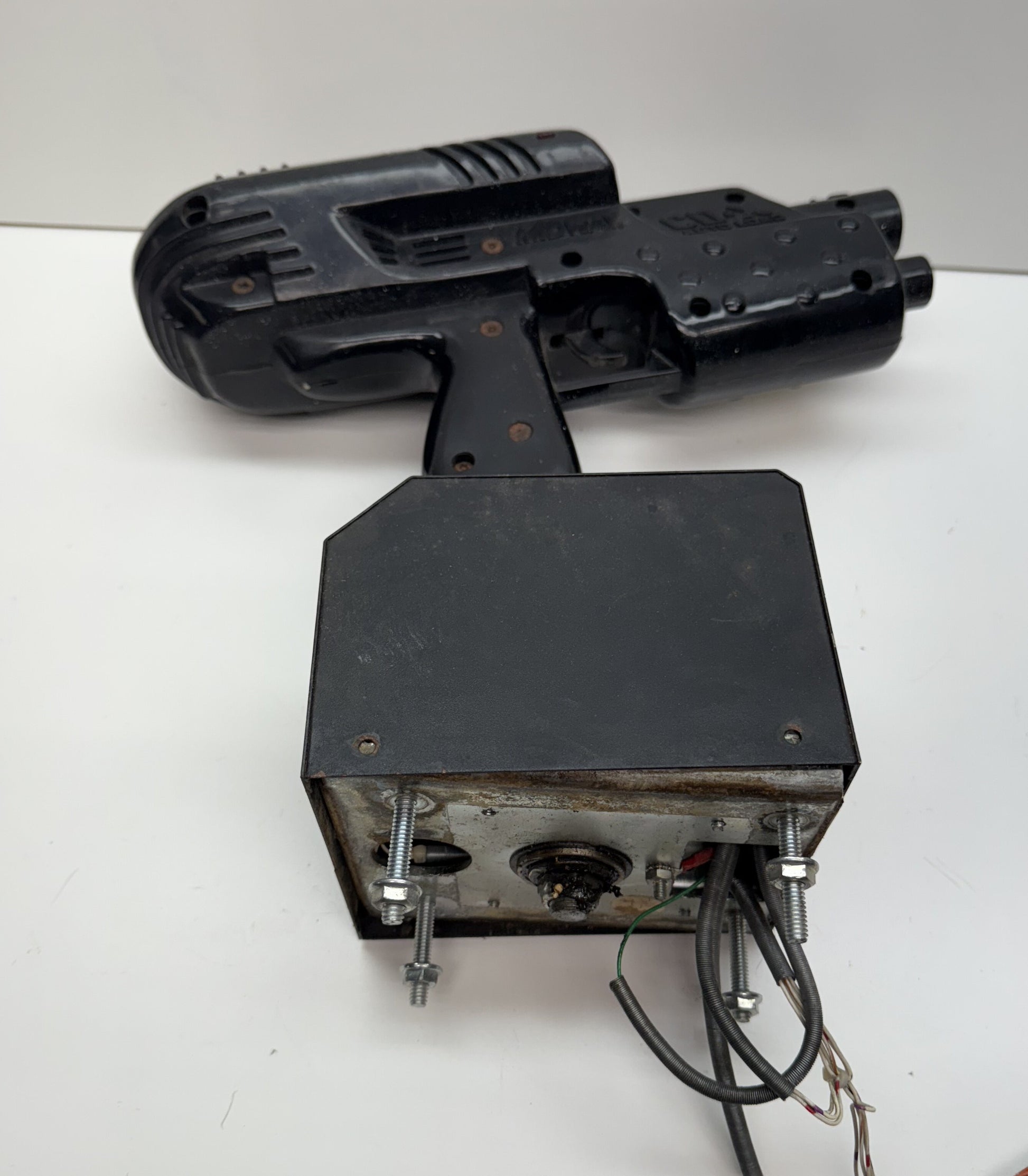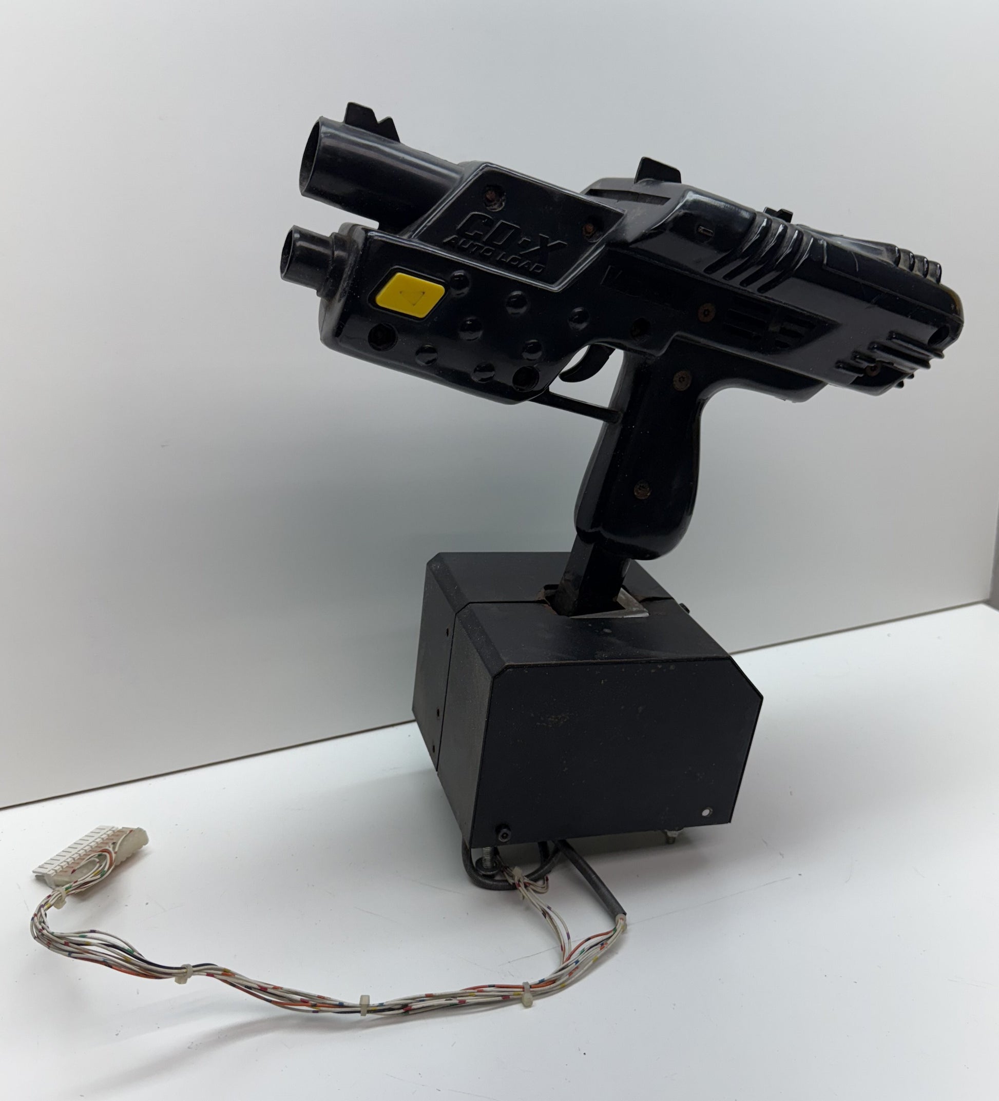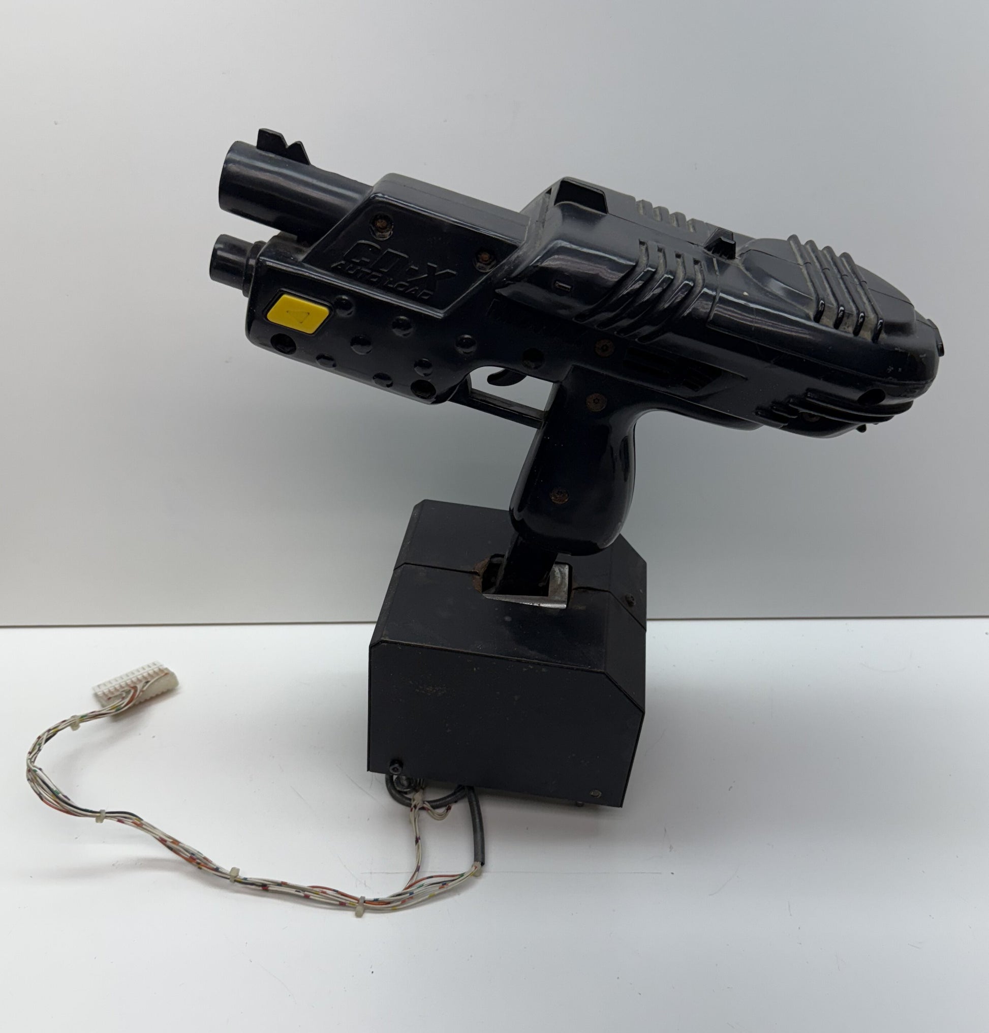 Original Midway Revolution X upright arcade game gun assembly in used condition. This one was found in a warehouse cleanout. It is untested, we have no idea if it works. It has some typical wear, we gave it a quick cleaning, but it could use a more thorough cleaning.