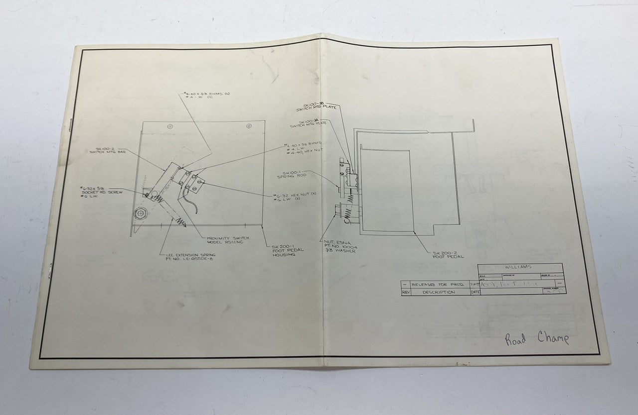 Original Williams Road Champion arcade game drawing set / schematics in good used condition. This is the schematic package only, includes game board and power supply schematics and game wiring information.