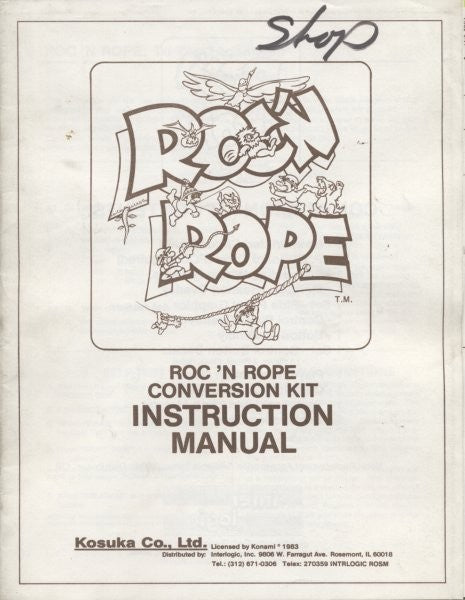 Konami Roc 'N Rope arcade game instruction manual. Includes game operation information, settings and pull-out schematics.