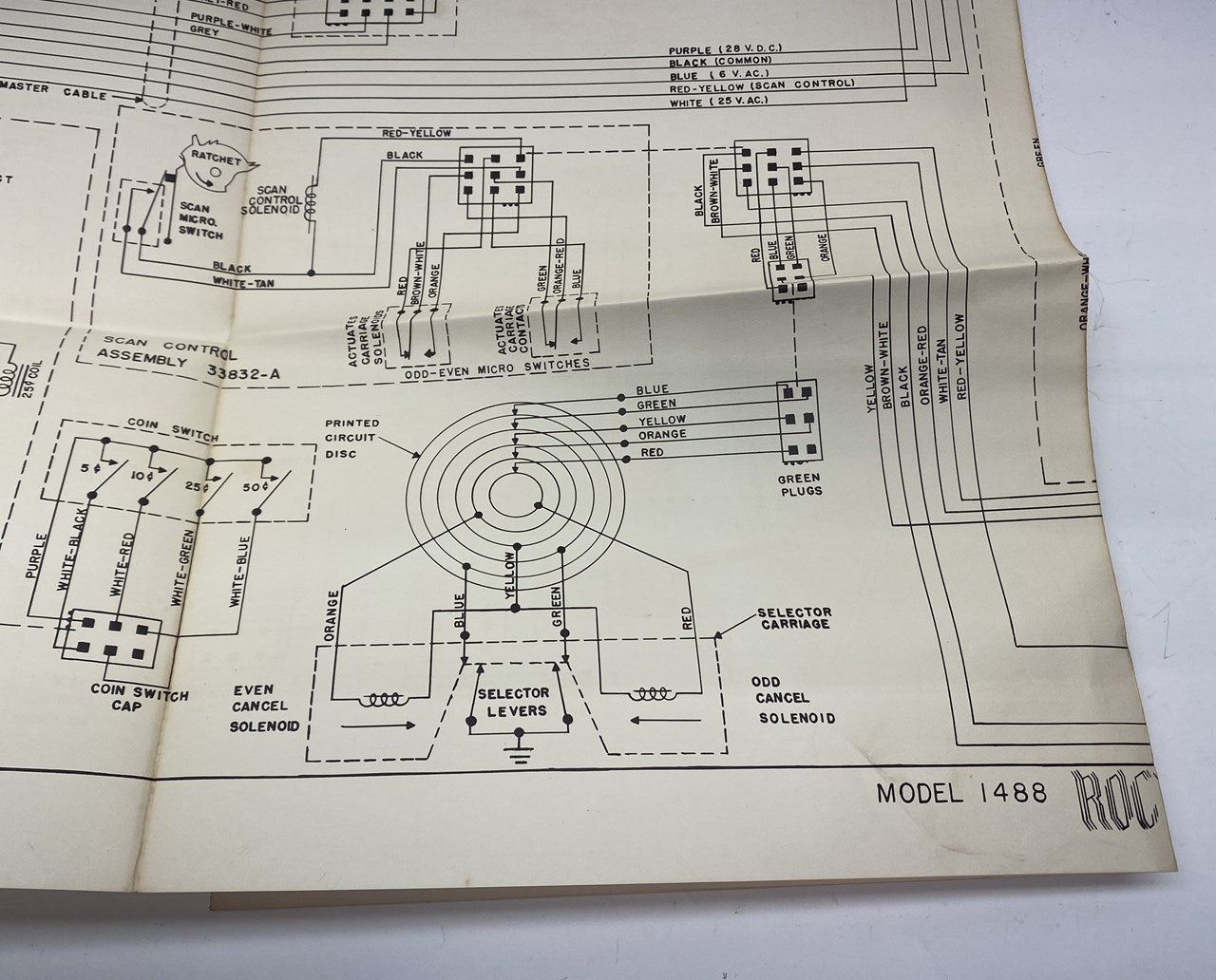 Original Rock-Ola Model Model 1488 large fold-out schematic diagram set in used condition with some typical wear.