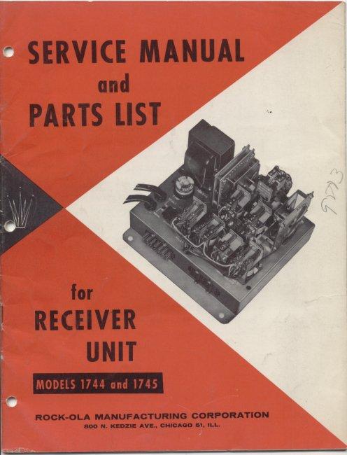 Original Rock-Ola Model 1744 and 1765 Receiver Unit Service Manual and Parts Lists in good condition.