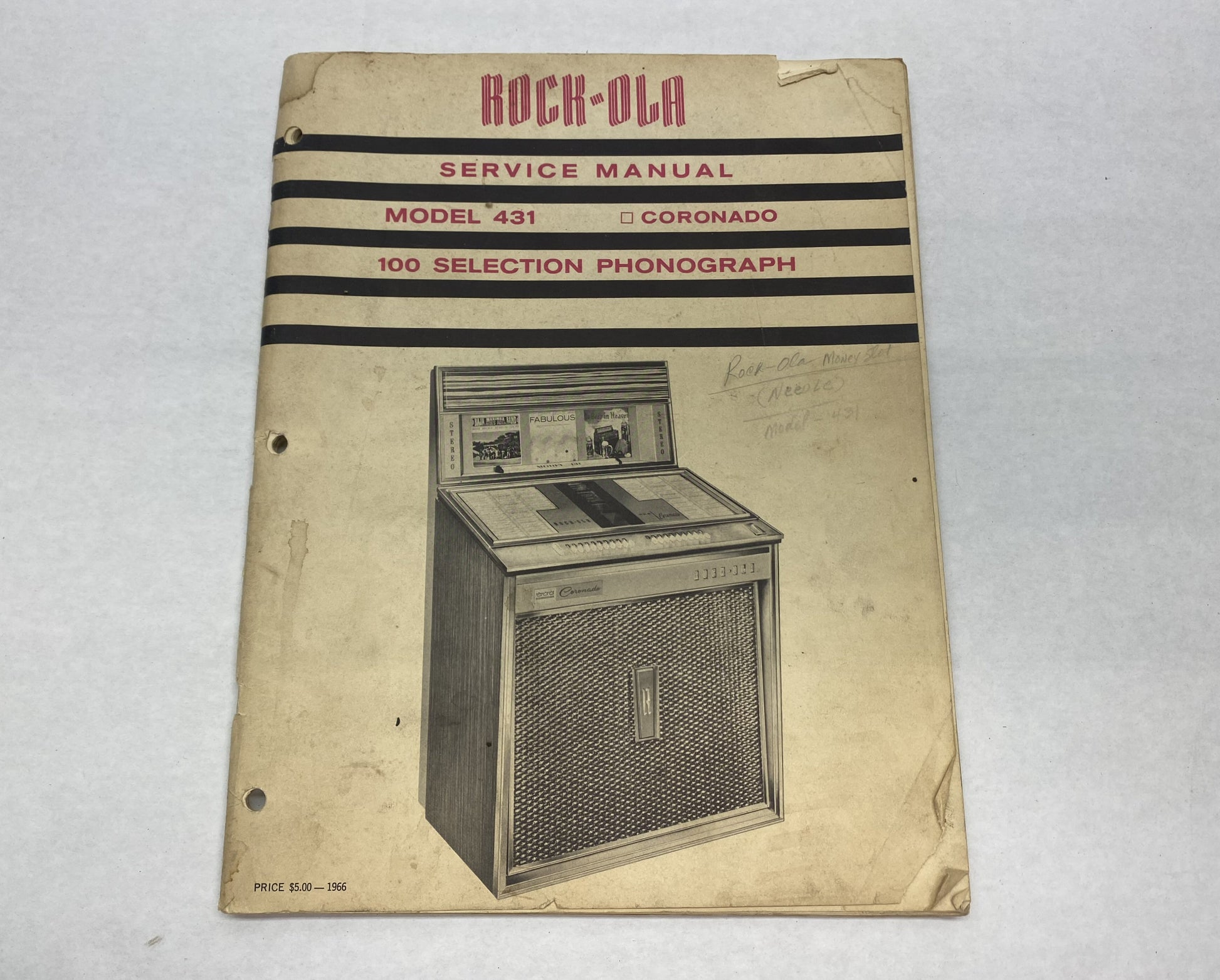 Original Rock-Ola Service Manual for Model 431 Coronado phonographs. This 54 page manual has some typical wear given its age. Note that there is a small piece of paper missing on the back cover diagram (see photo).