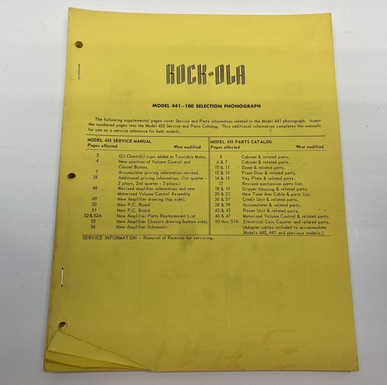 Rock-Ola Parts Manual for Model 441 phonographs. This appears to include some supplemental parts pages as well as a Parts listing for Model 441 jukeboxes.
