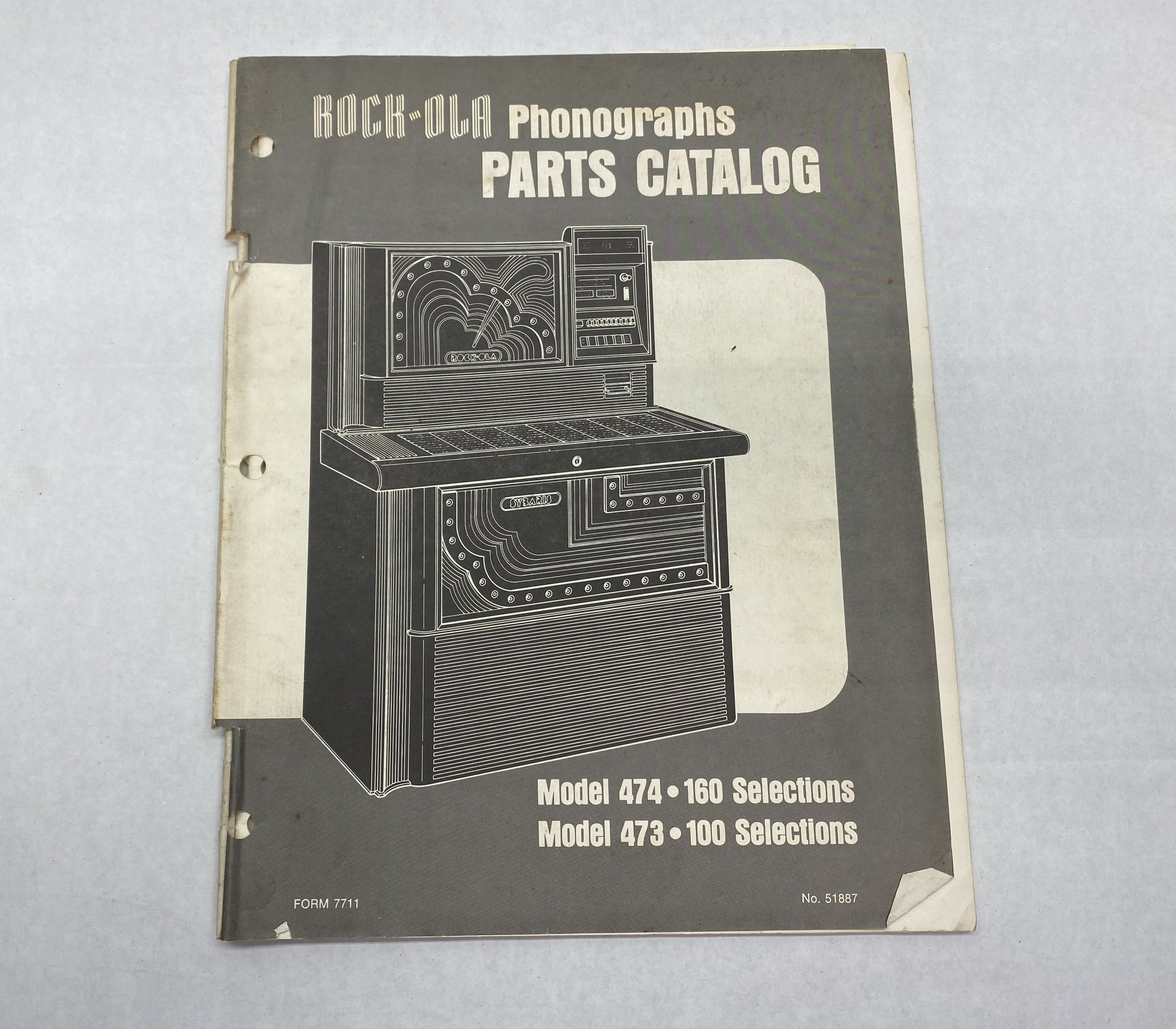 Original Rock-Ola Parts Catalog for Model 473 and 474, 100/160 selections phonographs. This manual does have some cover wear and the cover is loose.
