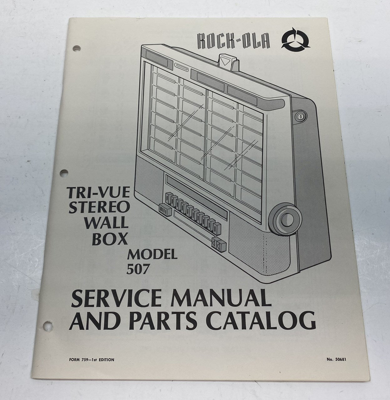 Original Rock-Ola Service Manual and Parts Catalog for Model 507 Tri-Vue Stereo Wall Box. This 45 page manual is in very good used condition for its age.