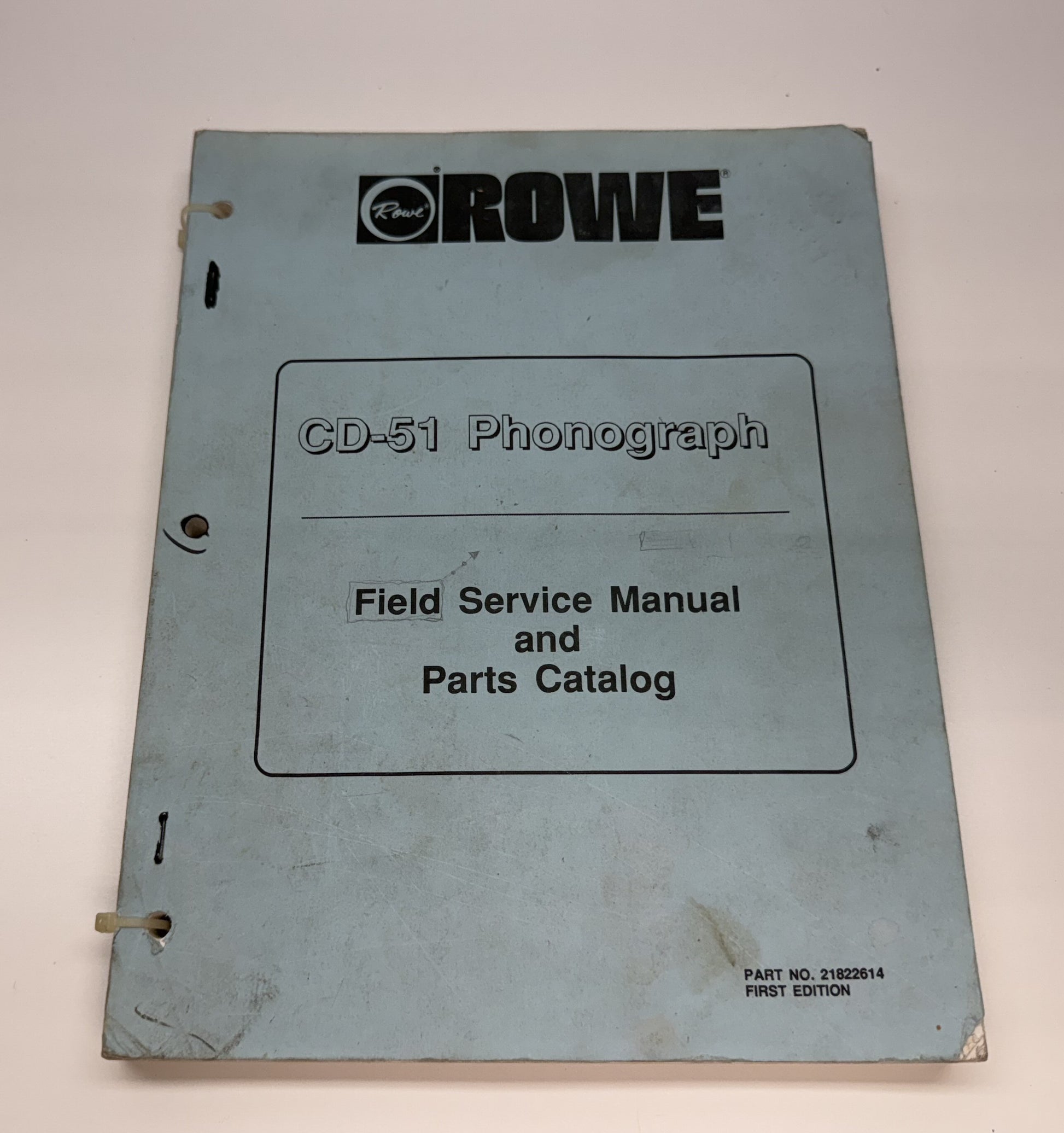 Rowe CD-51 LaserStar compact disc phonograph Field Service Manual and Parts Catalog in good used condition. Manual is missing its back cover, but otherwise complete.
