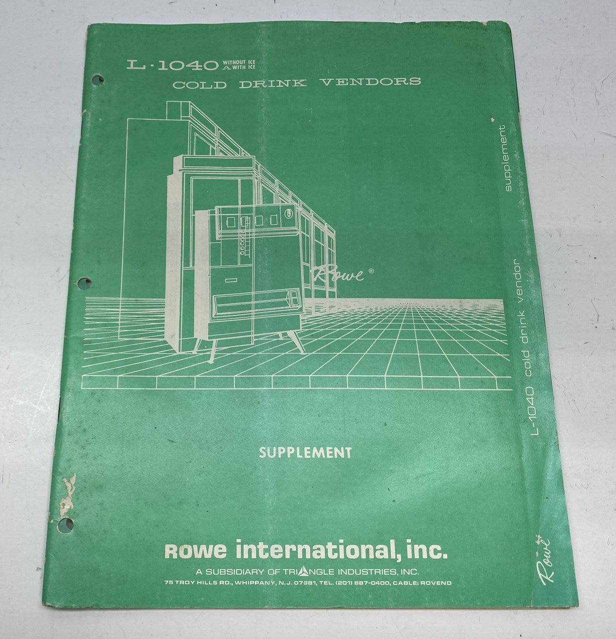 Original Rowe L-1040 Cold Drink Vendors Supplement Manual in used condition. Includes parts list and schematics among other info.