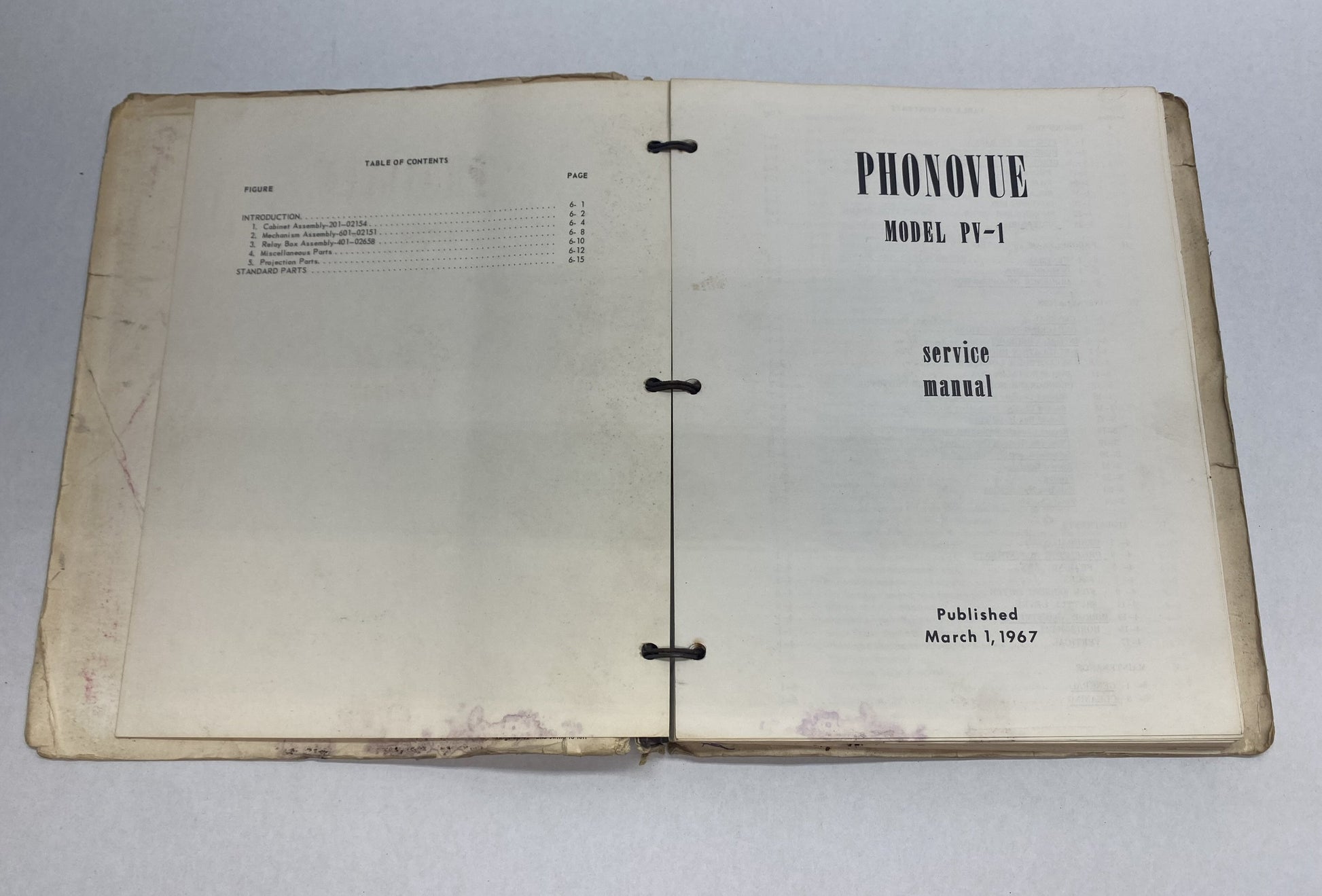Original Rowe The Phono Vue (PV-1) jukebox Service Manual in used condition with a bit of cover wear. This manual is loaded with technical info and parts information.