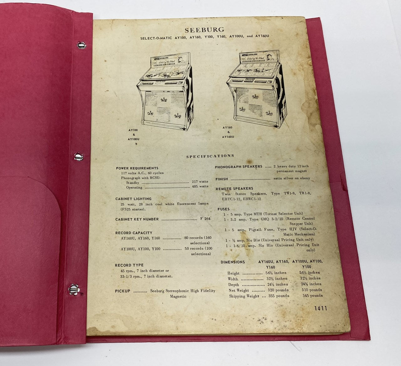 Folder loaded with Seeburg AY100, AY160, Y100, Y160 phonograph documentation. Over 80 pages of original setup and troubleshooting information is included in this folder.
