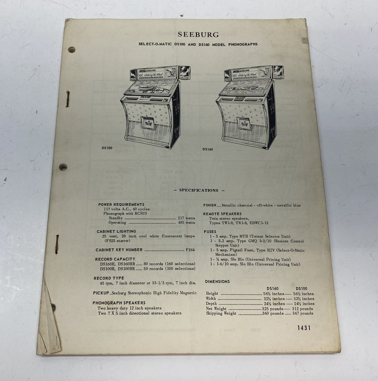 Original Seeburg DS100 and DS160 phonograph Service manual in used condition. This one is missing its front cover, otherwise appears complete with a bit of information (manual is about 80 pages or more).
