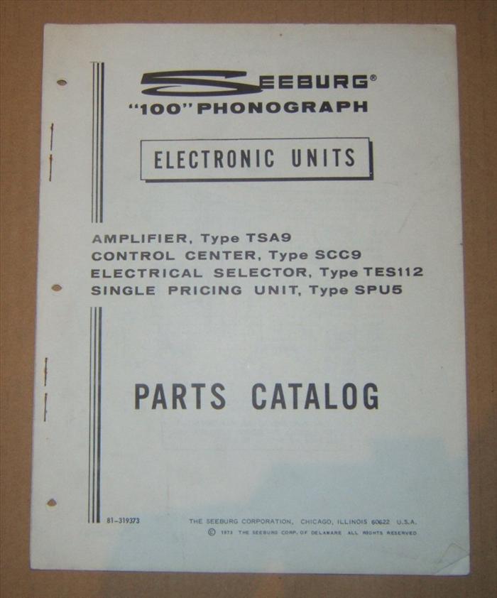 Original Seeburg Phonograph Electronic Units Parts Catalog in good condition for the following items: Type TSA9, SCC9, TES112, SPU5.
