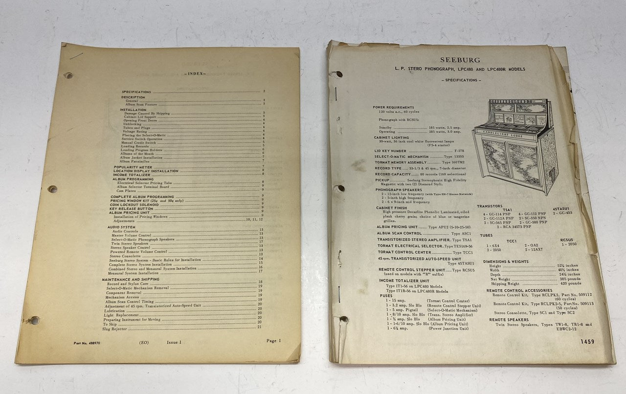 Original Seeburg LPC 480 series (LPC480 and LPC480R Models) phonograph service manual in used condition. Manual is missing its front cover. Includes another smaller manual we found with it.