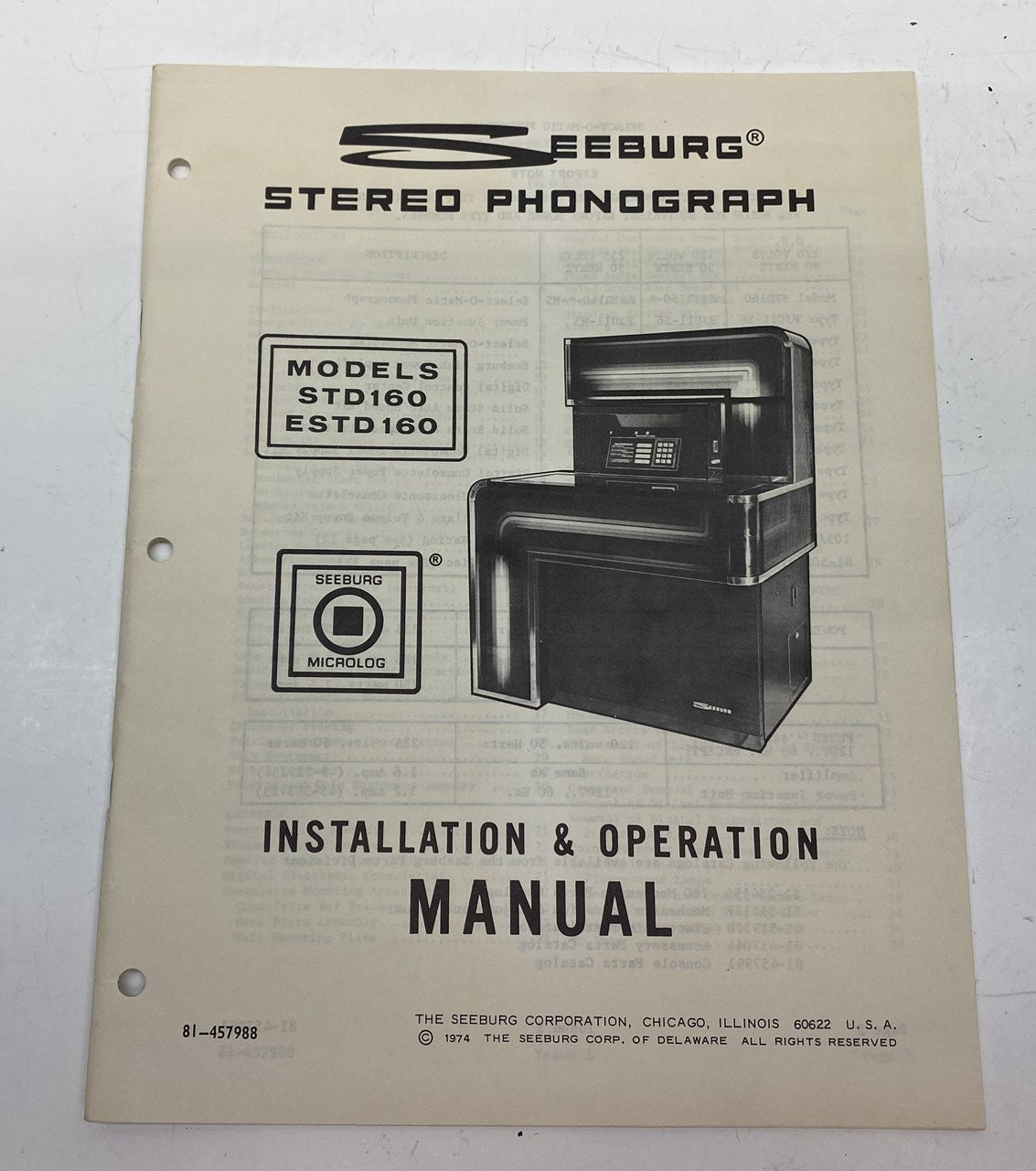 Original Seeburg Model STD160 and ESTD160 phonograph installation and operation manual from 1974 in good, used condition.