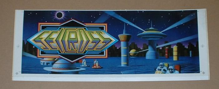 New old stock (NOS) Seicross arcade game vinyl marquee. Marquee has never been used, designed to be stuck on a piece of glass (it has adhesive on the back).