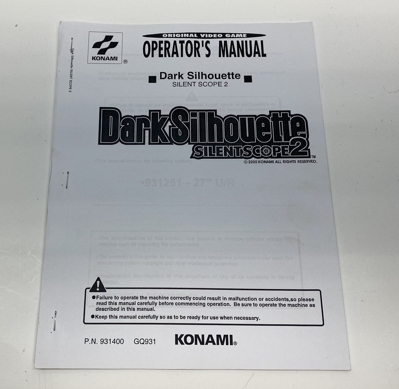 Original Konami Silent Scope 2: Dark Silhouette Operator's Manual in good condition. Includes game operator and setup information, troubleshooting tips and wiring diagrams.