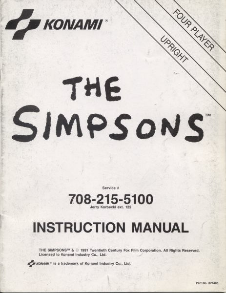 Konami Simpsons arcade game instruction manual. Includes game operation information, dipswitch settings and wiring diagrams among other things.