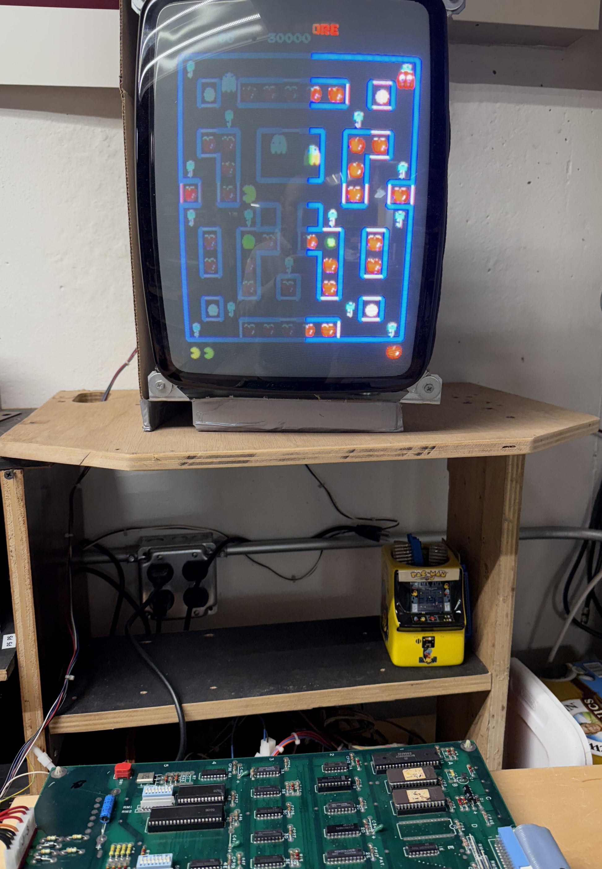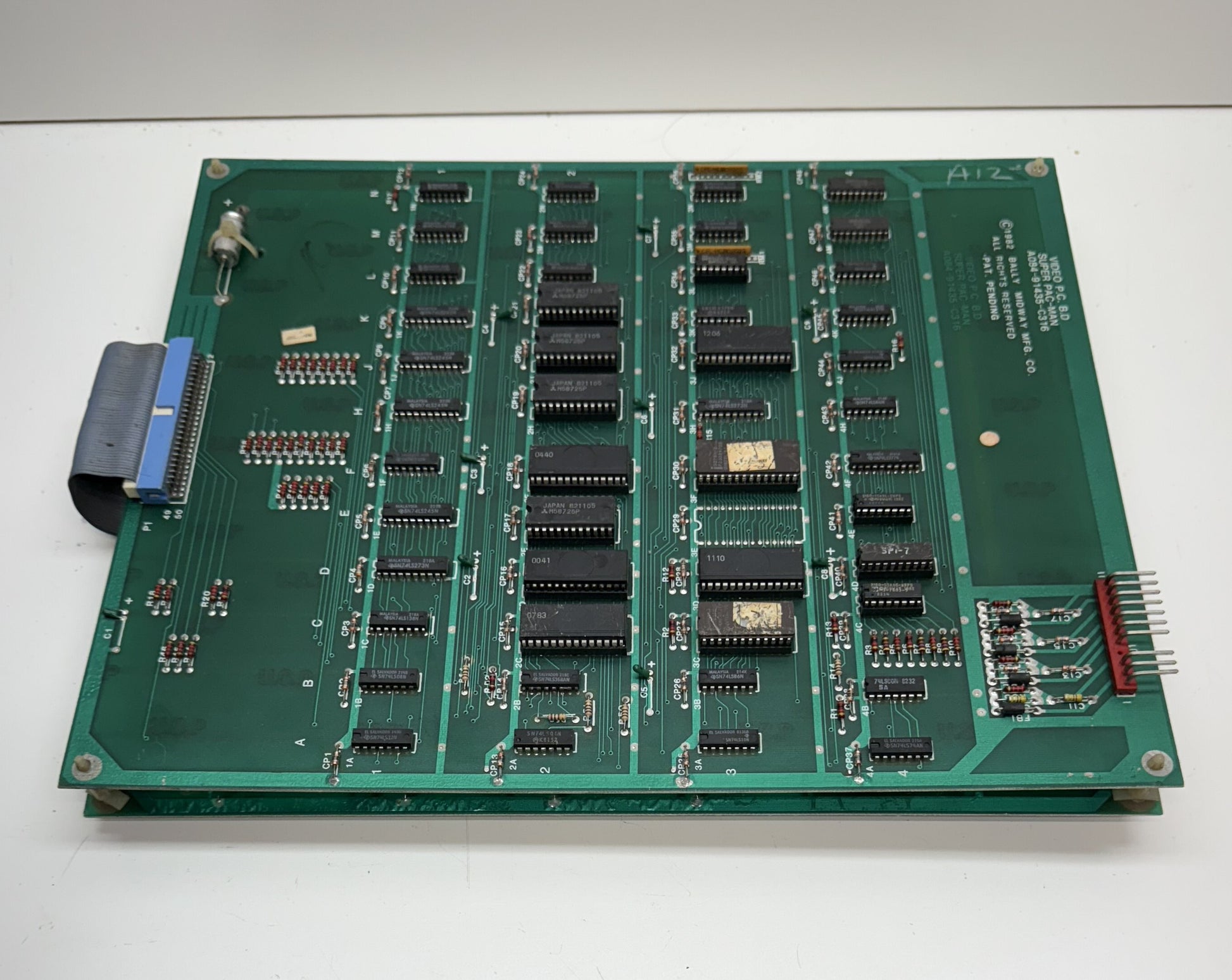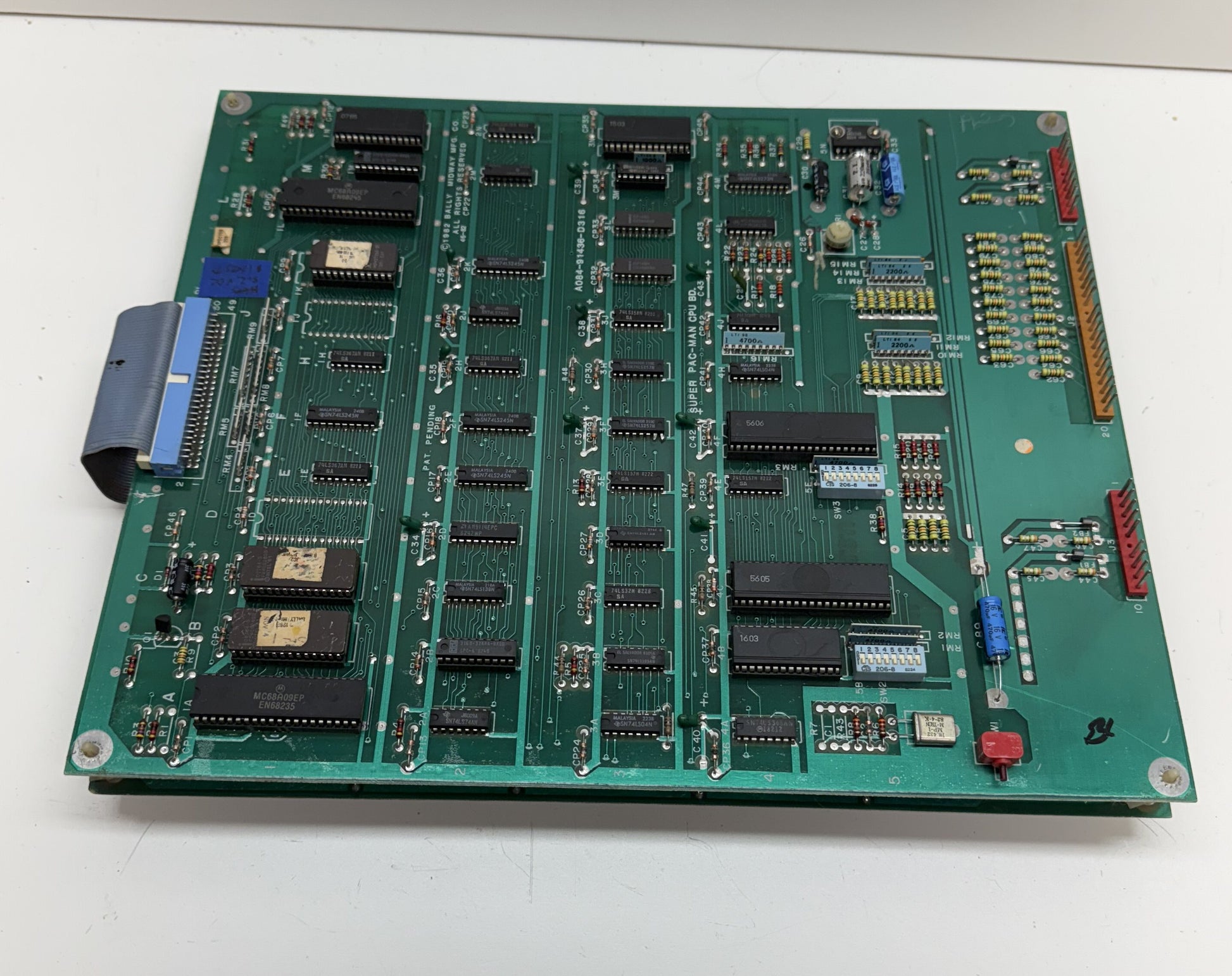 Original Bally Midway Super Pac-Man arcade game circuit board from 1982 that boots up and plays with video issues. This one is close to working, some of the objects have some "sparkling" effects. Adjust the voltage up helps to clear it up, but something isn't just right. We believe the issue is with the CPU board, but haven't done much troubleshooting other than swapping out some socketed ICs (that were okay).
