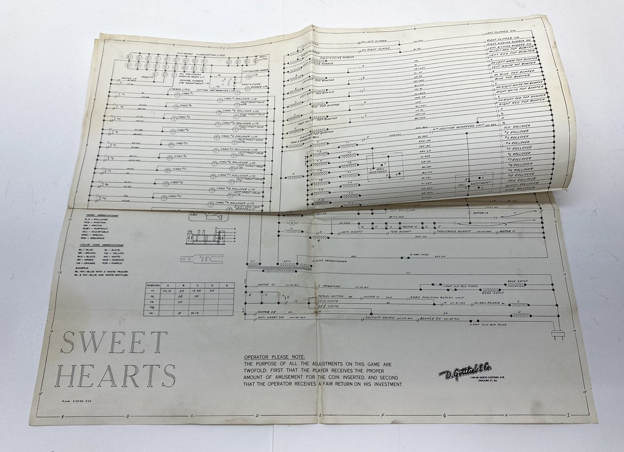 Gottlieb Sweet Hearts pinball machine schematic/wiring diagram from 1963. This one may be a old copy, but it is in usable condition.