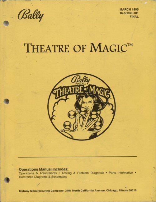 Original Bally Theatre of Magic pinball machine manual from 1995 in good condition. Includes operations and adjustments guide, testing and problem diagnosis, parts information and schematics, among other things.