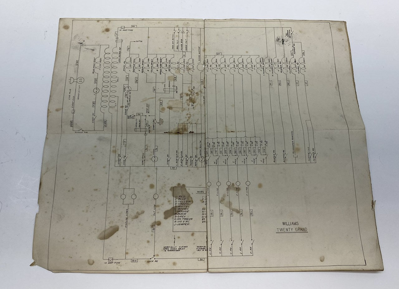 Original Williams Twenty Grand pinball machine schematics package in used condition with some staining, but usable.