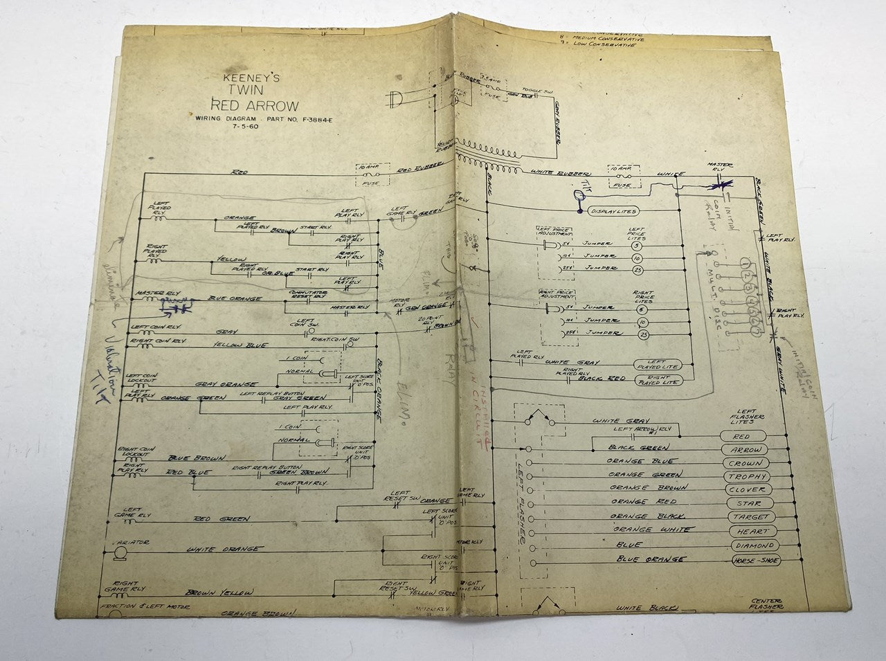 Original Keeney's Twin Red Arrow coin-op machine wiring diagram schematics in used condition.