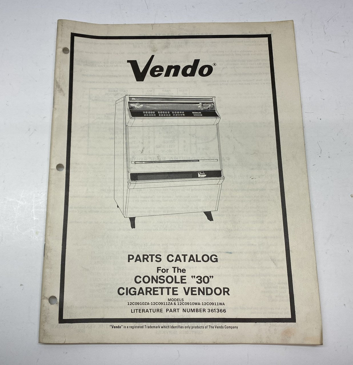 Original Vendo Console 30 Cigarette Vendor Parts Catalog in good used condition.