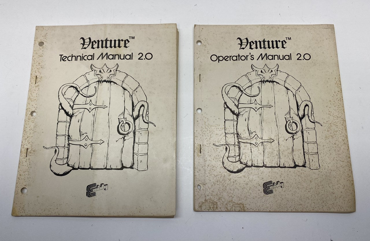 Exidy Venture arcade game Operator's manual, version 2.0 and Technical Manual 2.0. Manuals have some staining on the covers but are legible. Includes game operation information, game settings info and wiring information among other things.