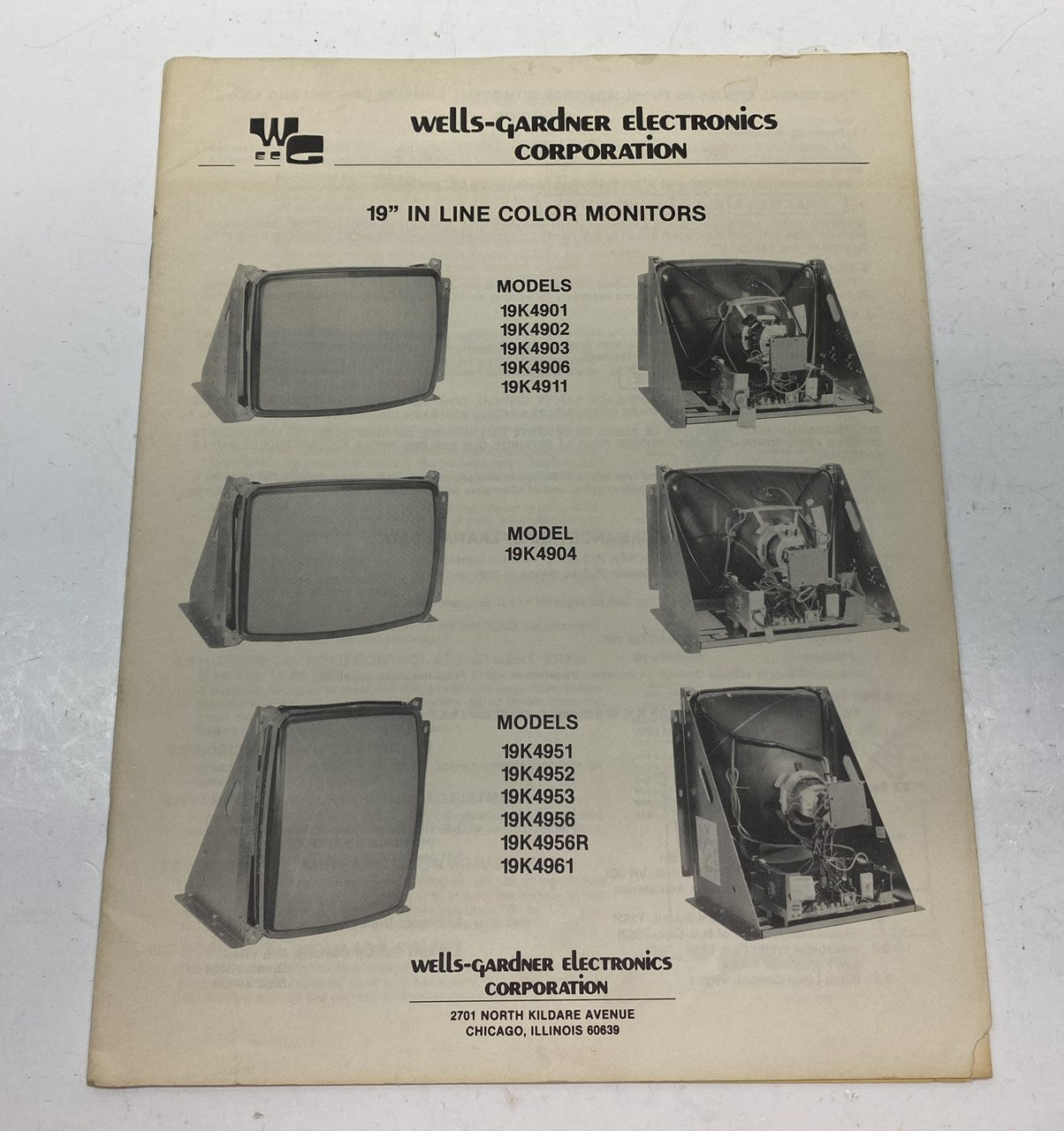 Original Service Manual for Wells Gardner K4900 series monitors (models 19K4901 to 19K4961). Includes adjustment information, schematics and parts lists, among other things.