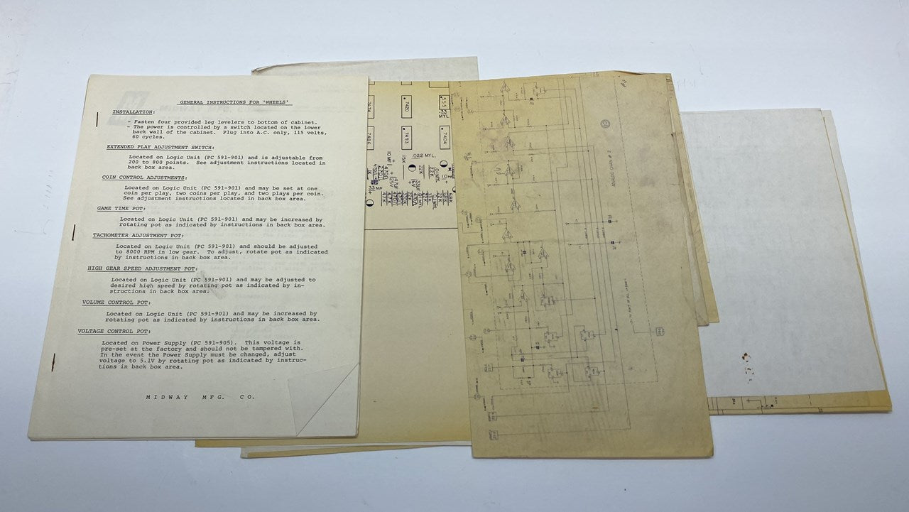 Original Midway Wheels game Manual and related paperwork in good condition. Includes pull out schematics, game operating information, parts lists and other information.