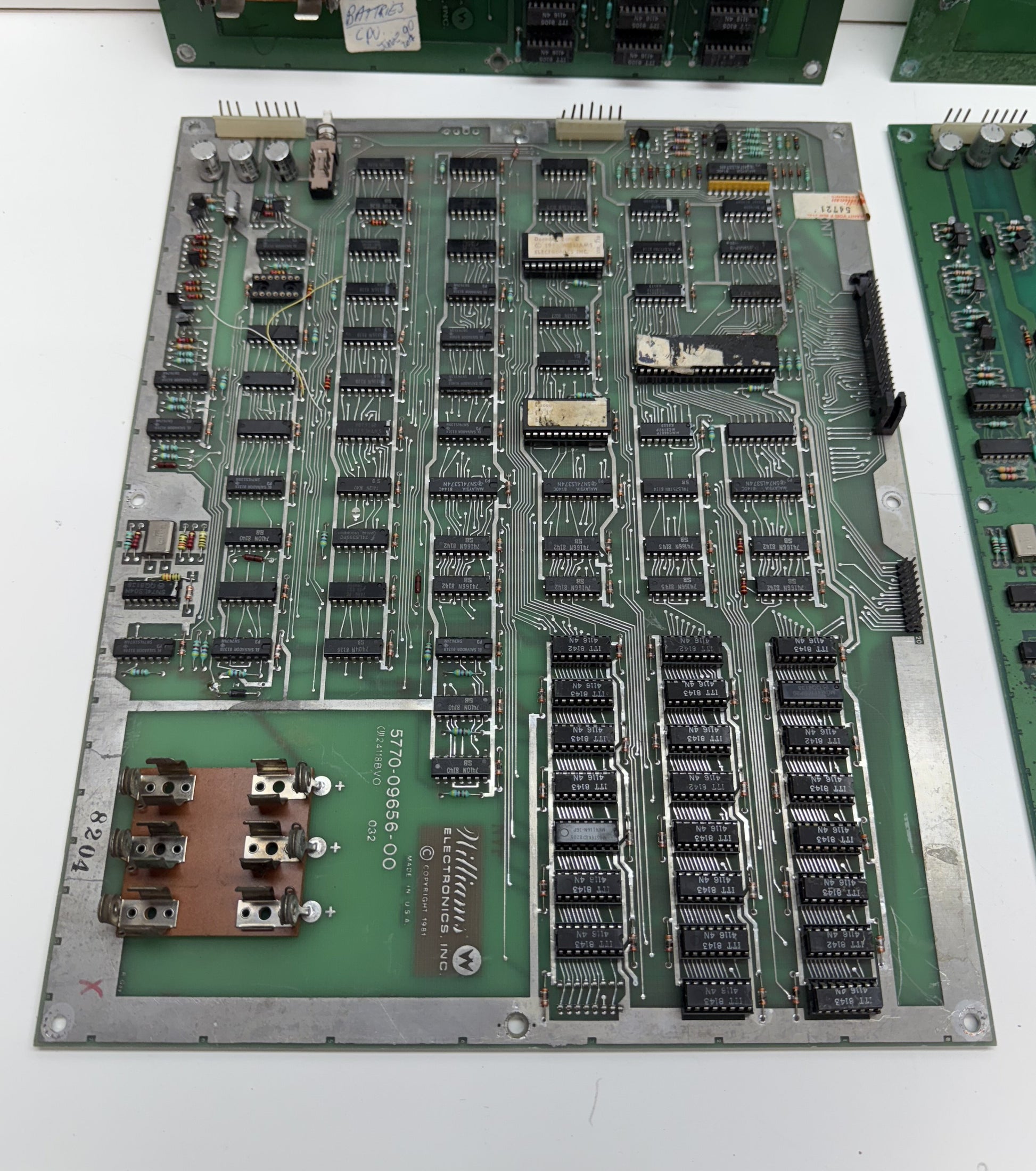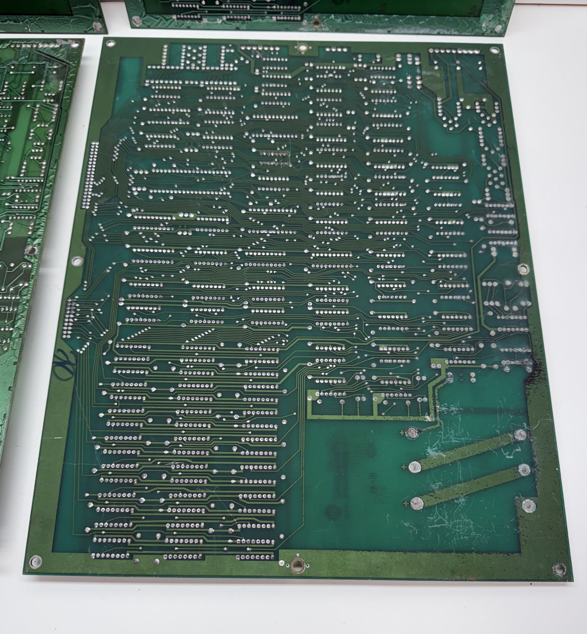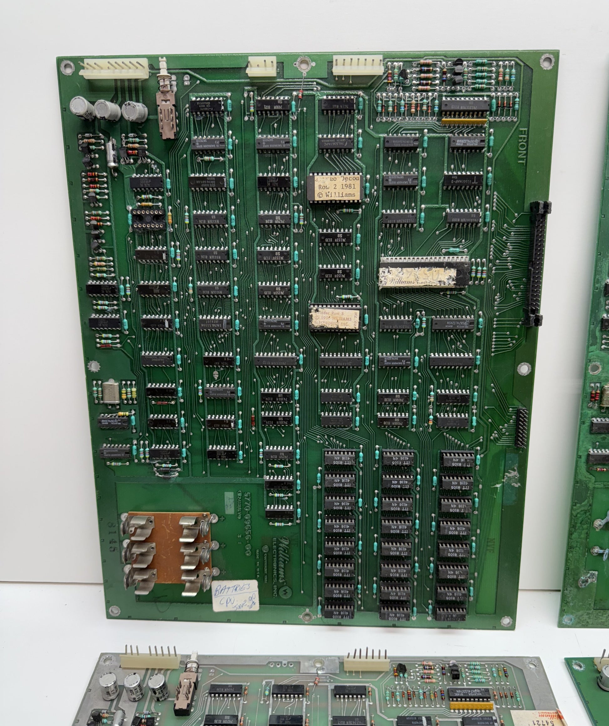 Lot of four original Williams CPU boards that appear to be from Defender and Stargate. Listing includes the four boards as shown, they will need repair as most of them are missing their decoder roms and processors and one has corrosion damage.