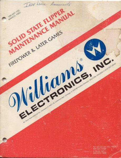 Williams Sold State Flipper Maintenance Manual. Includes information on game adjustment, book keeping, diagnostic and troubleshooting procedures for Williams solid state games from Firepower and forward.