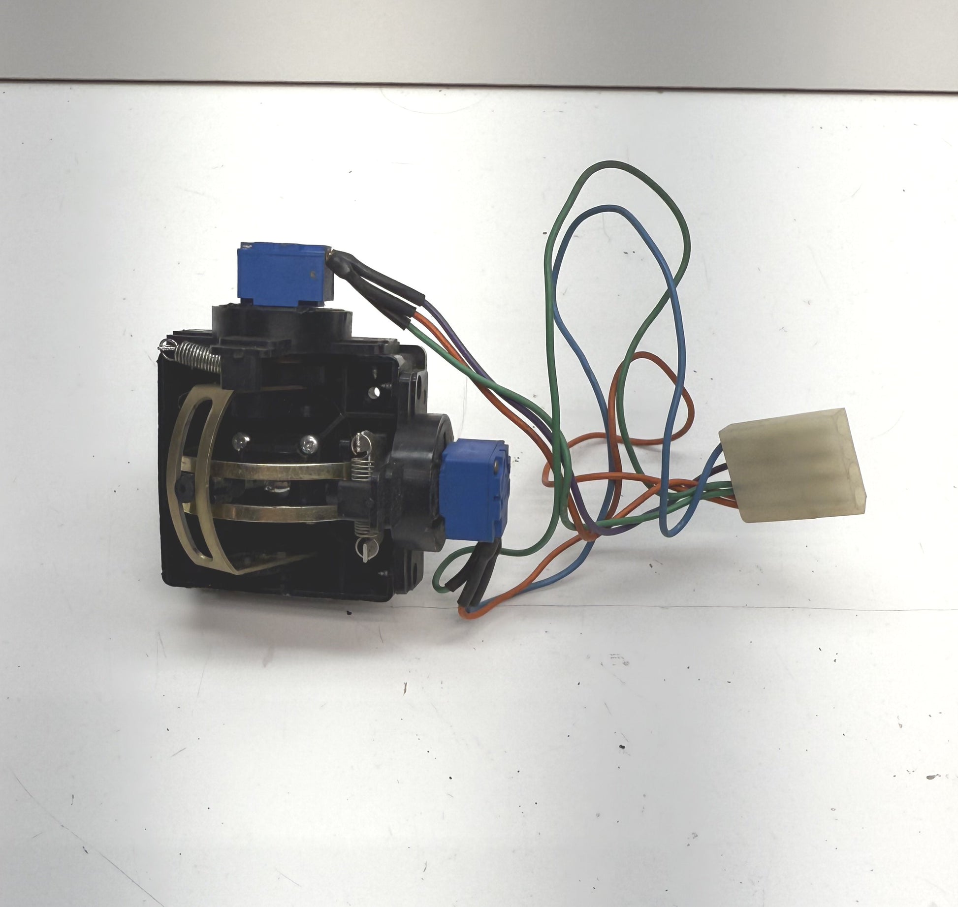 Original Cinematronics / Leland small metal joystick in used condition. This is a spring loaded joystick that does not return to the center when used. It moves on both axes. We believe it was used on World Series games and/or Quarterback arcade games.