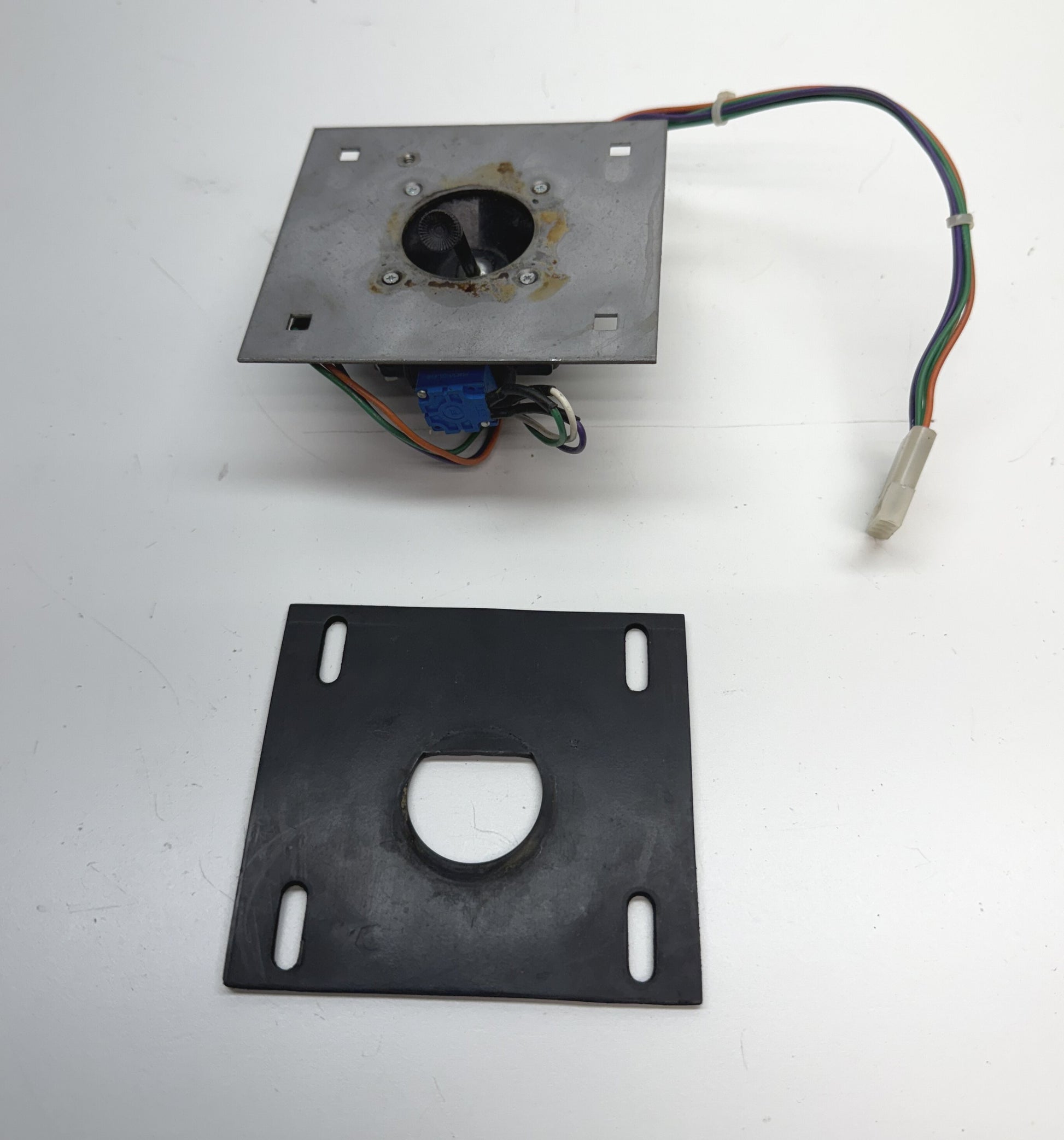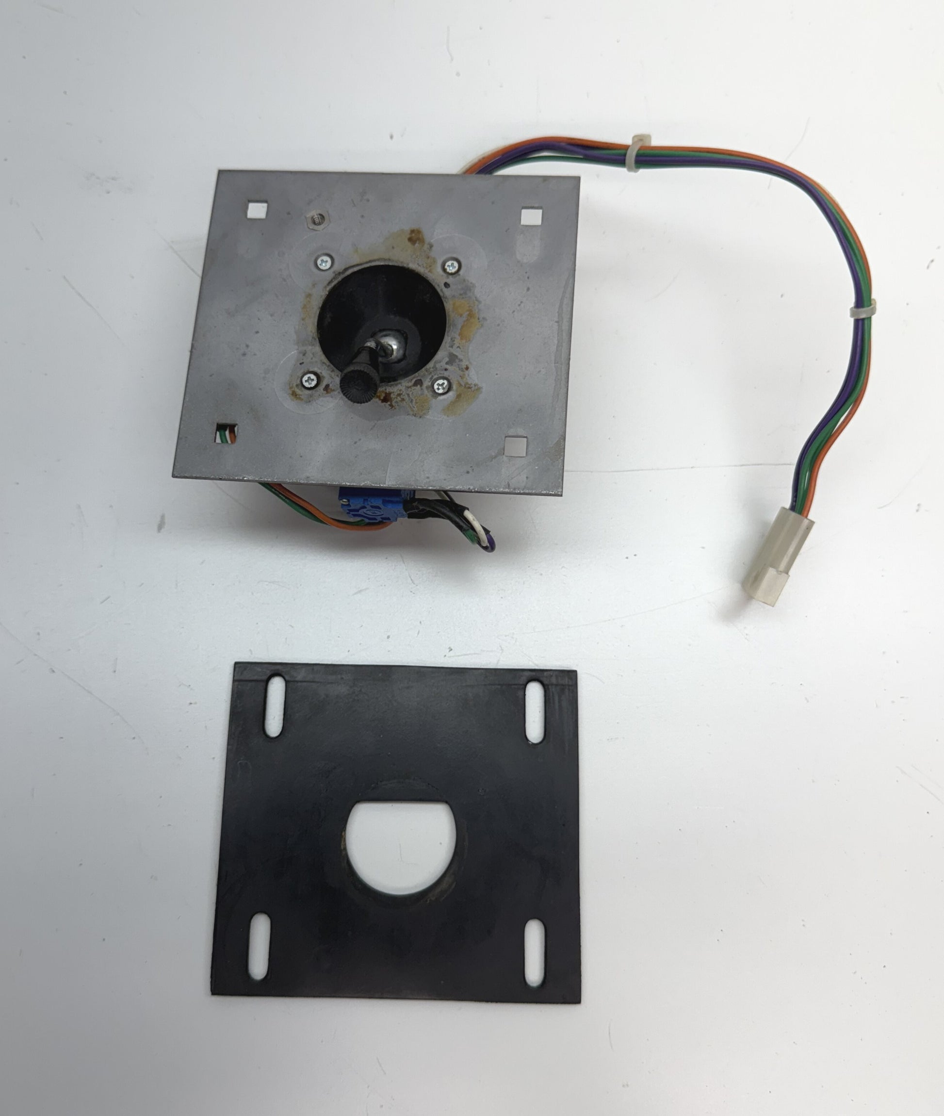 Original Cinematronics / Leland small metal joystick in used condition. This is a spring loaded joystick that does not return to the center when used. It moves on both axes. We believe it was used on World Series games and/or Quarterback arcade games.