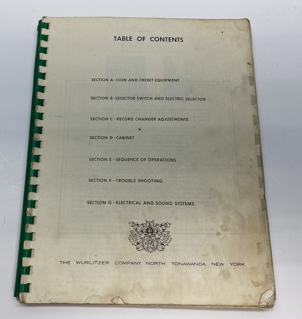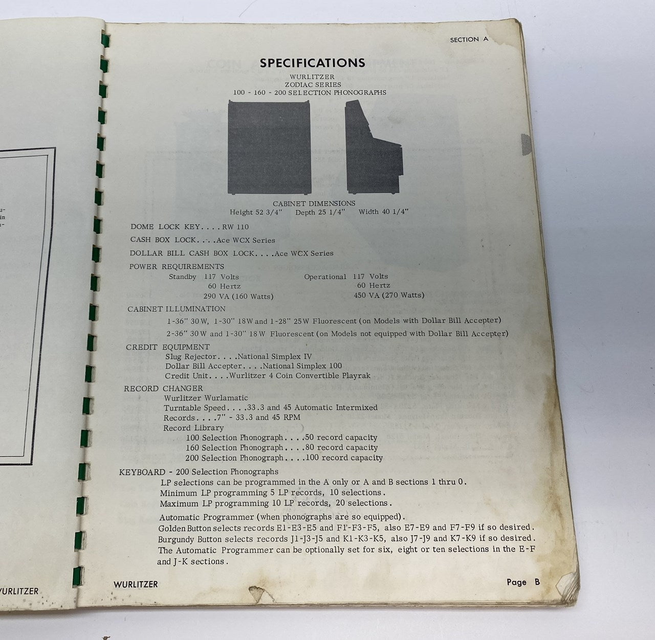 Original Wurlitzer jukebox service manual for its Zodiac series jukeboxes. This manual is missing its front cover and has some typical wear but is usable.